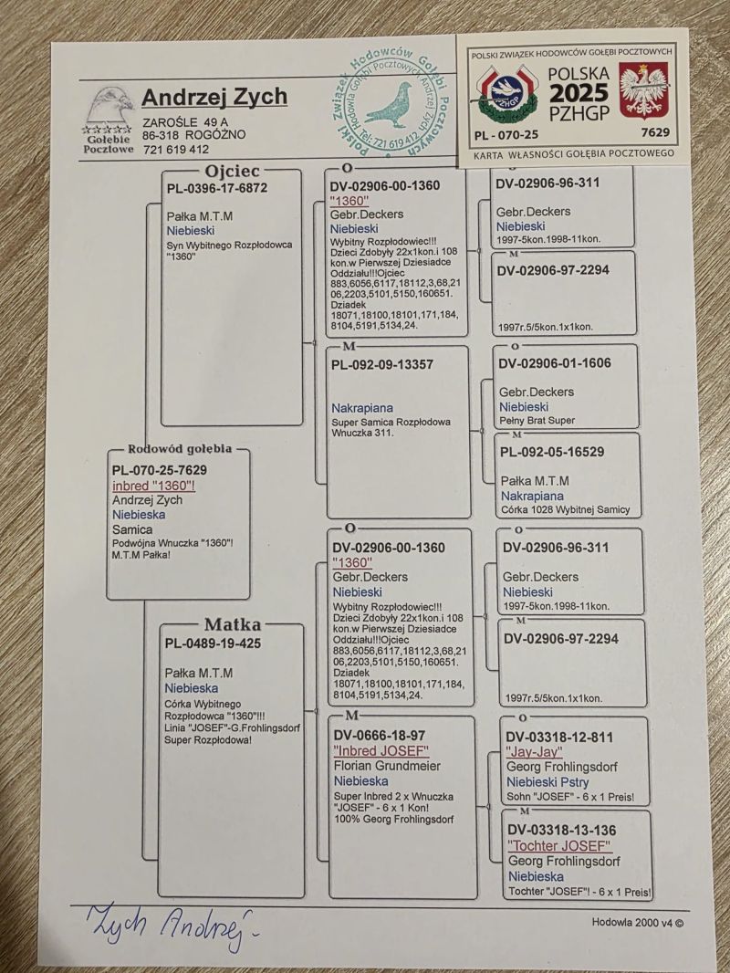 Oryginalny gołąb z hodowli Andrzeja Zycha. Szczegóły pochodzenia zamieszczone w rodowodzie. Więcej informacji pod numerem telefonu: 721 619 412
