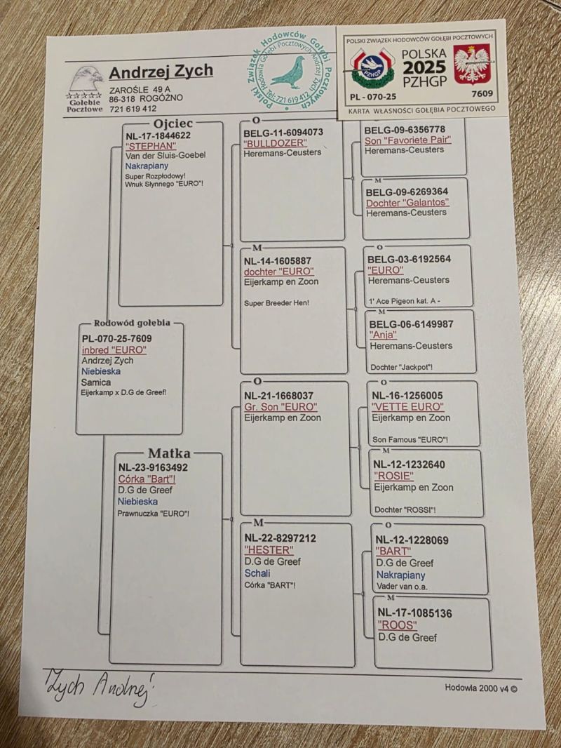 Oryginalny gołąb z hodowli Andrzeja Zycha. Szczegóły pochodzenia zamieszczone w rodowodzie. Więcej informacji pod numerem telefonu: 721 619 412