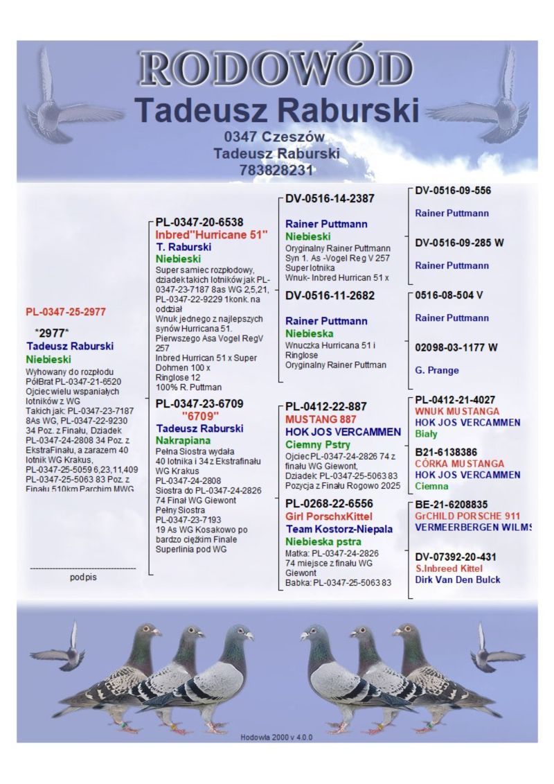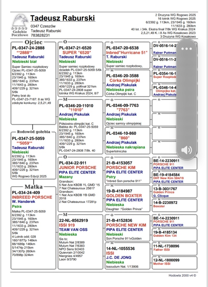Hodowla skupiona w lotach gołębi na wspólnych gołębnikach z wieloma sukcesami. Zaprasza Państwa do licytacji wartościowego materiału do dalszej hodowli. Proponowany gołąb to półsiostra "6520" Ojca i dziadka wielu wspaniałych lotników z WG. Linia moich dwóch bazowych par rozpłodowych, wielu kuzynów osiąga sukcesy na wspólnych gołębnikach. Więcej informacji w rodowodzie oraz pod nr. tel. WYSYŁKA 100ZŁ