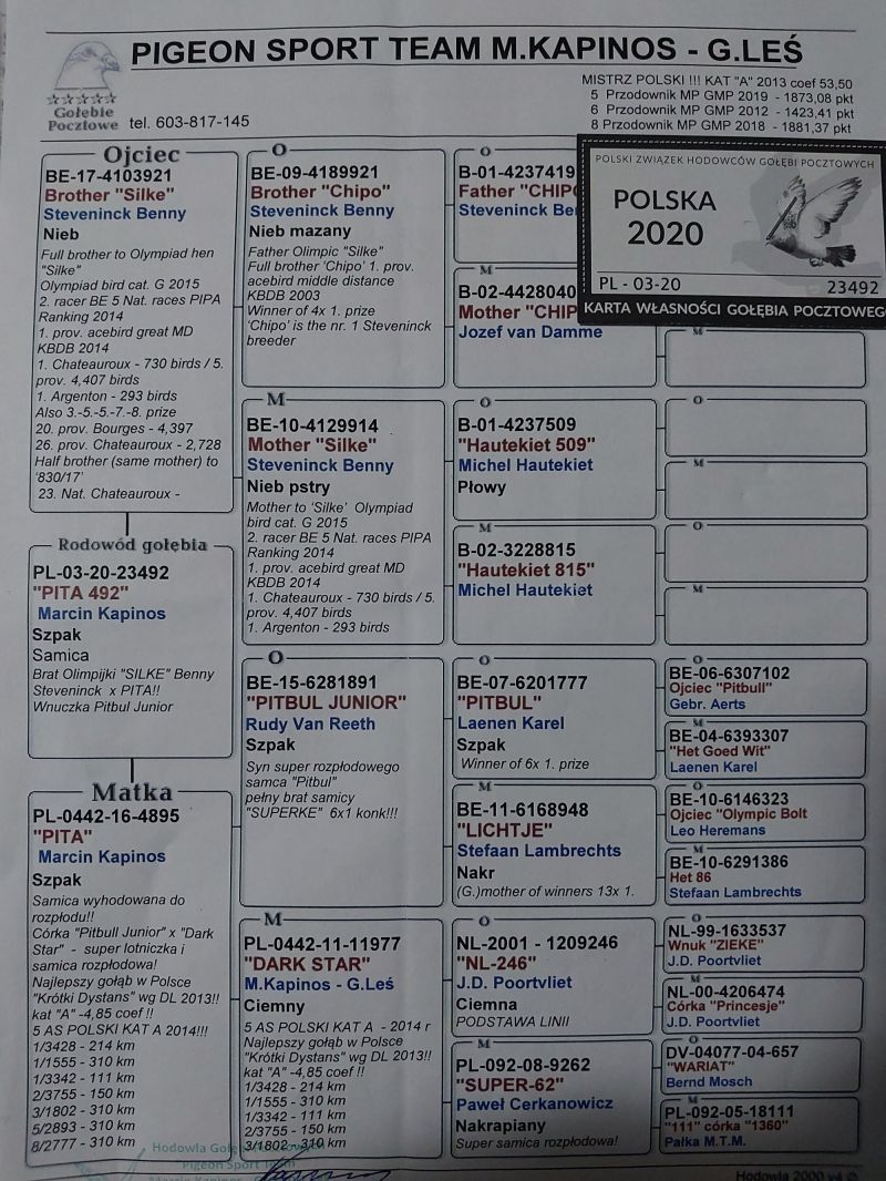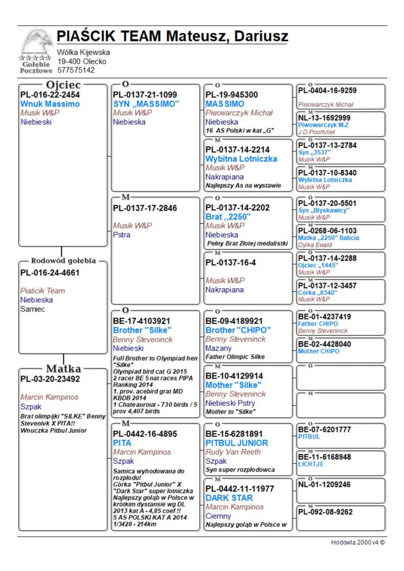 DZIECKO SAMCA "2454"{JEST ON WNUKIEM PODSTAWOWEGO SAMCA ROZPŁODOWEGO HODOWLI "MASSIMO 300" ORYG. MICHAŁ PIWOWARCZYK - 16AS POLSKI W KAT. G 2020R / SAMCZYK TEN JEST OJCEM I DZIADKIEM WIELU CZOŁOWYCH LOTNIKÓW! |WNUK/WNUCZKA WYBITNEJ LOTNICZKI "14-2214" - 1AS OKRĘGU KATOWICE W KAT. D 2018R! M.IN.: 4, 6, 7, 7, 8, 10, 15, 15, 18.. |Wiecej informacji o gołębiu pod nr tel.:577575142 Szczegóły pochodzenia gołębia w rodowodzie