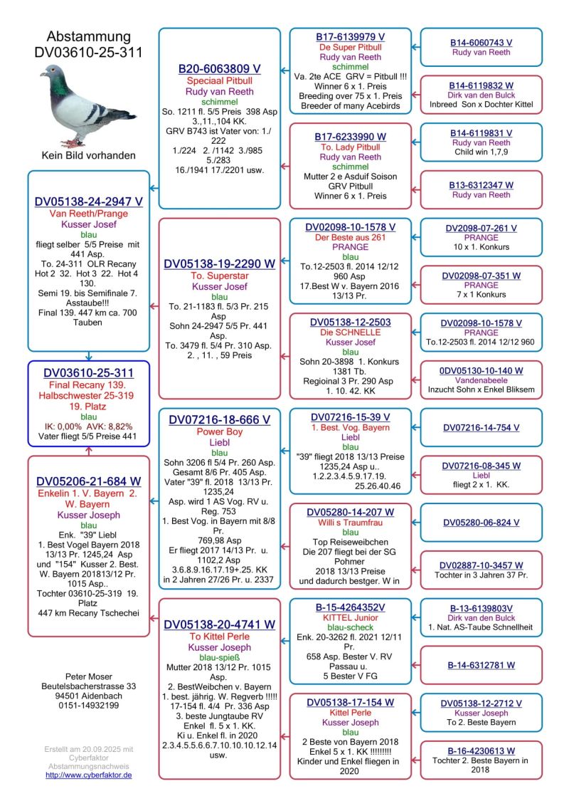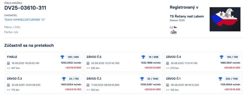 Gołąb po pełnym programie lotowym na WG TS Recany z finałem 447 km. Szczegóły pochodzenia i rodowód poniżej. Załączyłem link do strony z jej wynikami, wystarczy kliknąć. Link do wyników oneloftrace.live/lofts/45/teams/4370013/pigeons/34177083