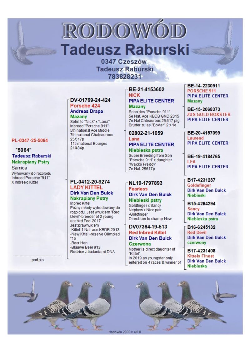 Hodowla skupiona w lotach gołębi na wspólnych gołębnikach z wieloma sukcesami. Zaprasza Państwa do licytacji wartościowego materiału do dalszej hodowli. Proponowany gołąb to dwie super linie gołębi wnuk inbreed Porsche 911 A. DRAPA x inbreed Kittel Więcej informacji w rodowodzie oraz pod nr. tel. WYSYŁKA 100ZŁ