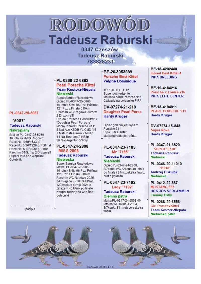 Hodowla skupiona w lotach gołębi na wspólnych gołębnikach z wieloma sukcesami. Zaprasza Państwa do licytacji wartościowego materiału do dalszej hodowli. Proponowany gołąb to linia Hardy Kruger I PEC Porsche 911, brat do 16 As/4058g. MWG Rogowo. Linia moich bazowych par rozpłodowych, wielu kuzynów osiąga sukcesy na wspólnych gołębnikach, i nie tylko. Więcej informacji w rodowodzie oraz pod nr. tel. WYSYŁKA 100ZŁ