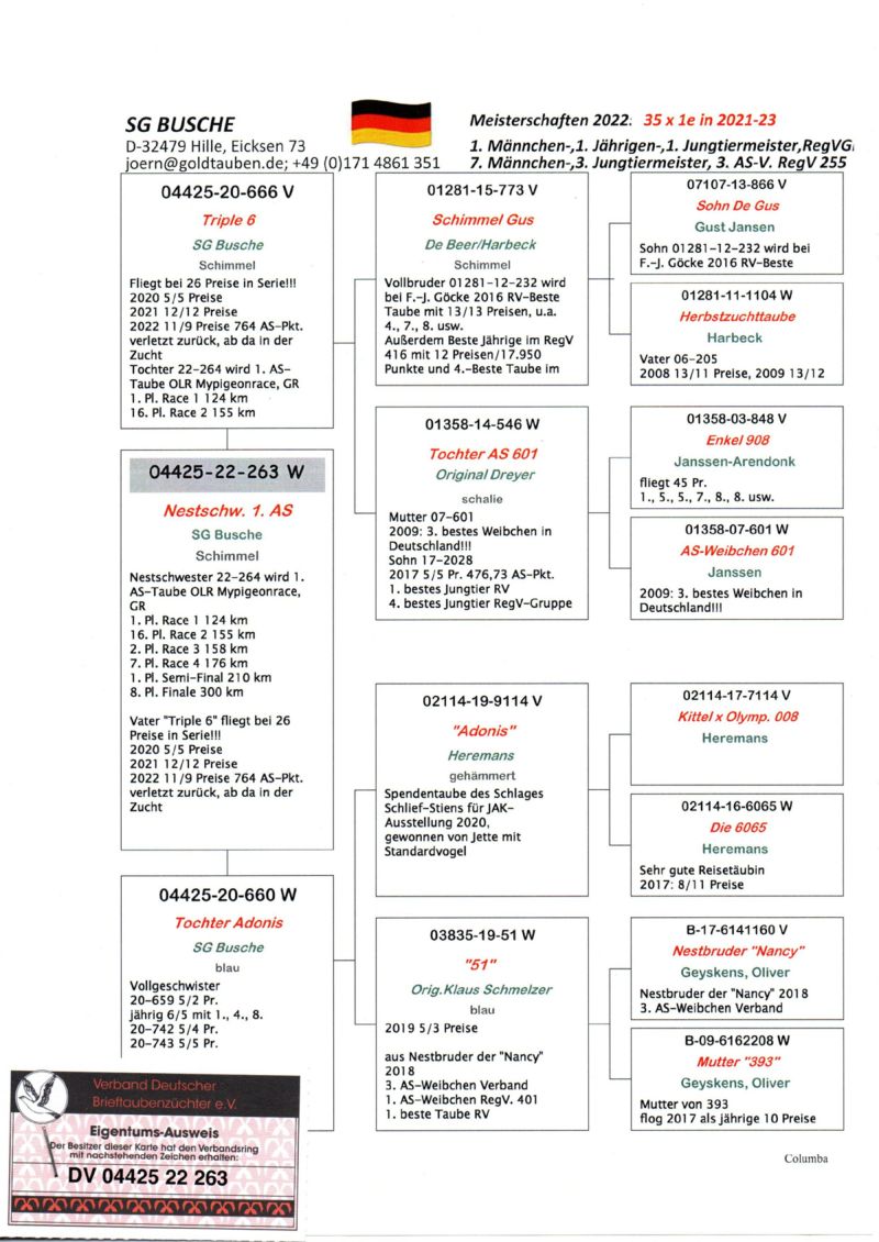 Szczegóły pochodzenia w rodowodzie oraz na opisanym zdjęciu gołębia.