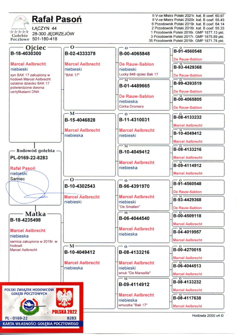 Szczegóły pochodzenia w rodowodzie oraz na opisanym zdjęciu gołębia.