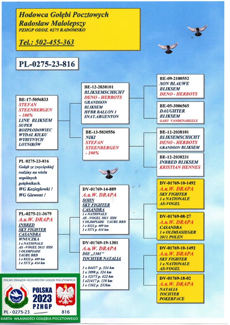 Szczegóły pochodzenia w rodowodzie oraz na opisanym zdjęciu gołębia.