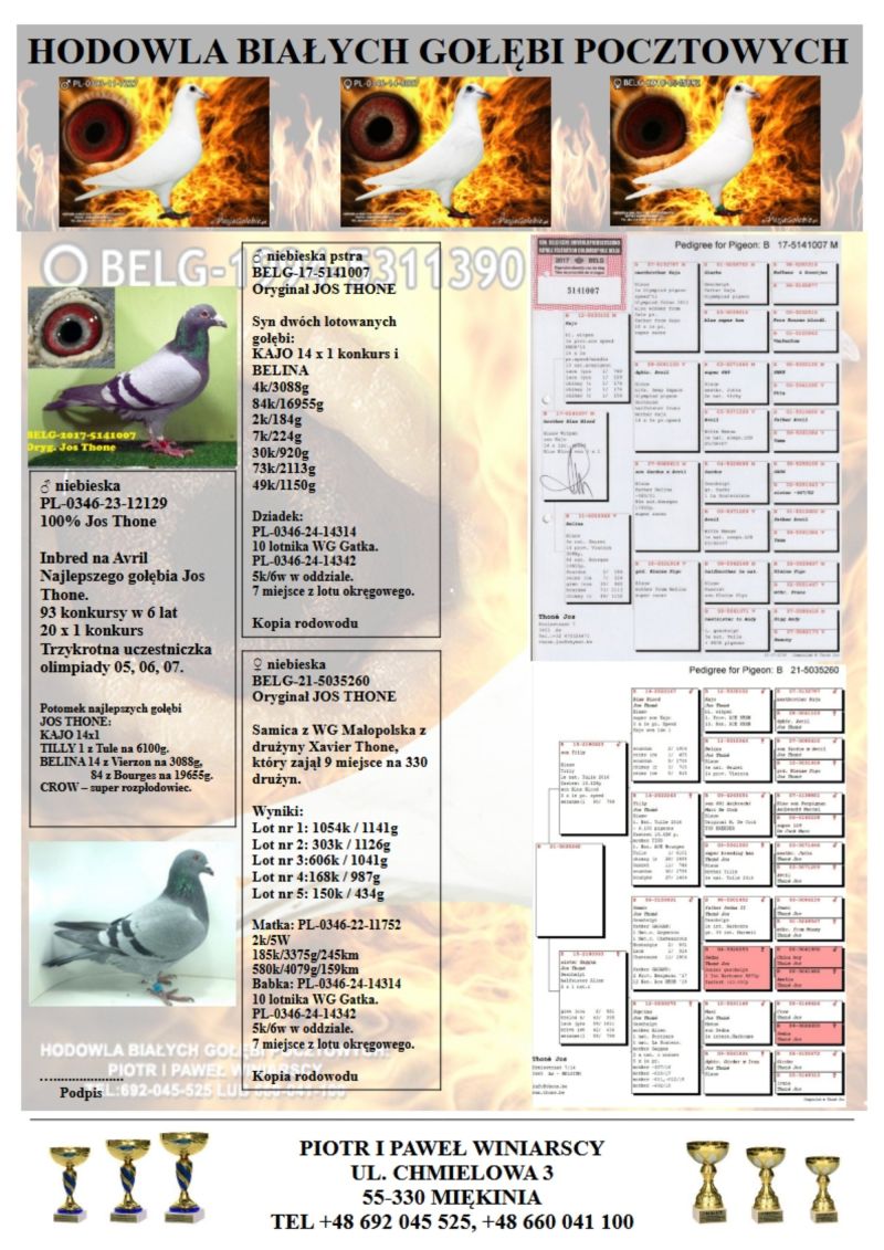 Kup teraz 500. Dzień dobry koleżanki i koledzy. Samiec 100% Jos Thoné. Inbredu na Avril, najlepszego gołębia Jos Thoné. Zachęcam do odwiedzenia strony Josa - thone.be/en/ .Golebie świetnie nadają się do krzyżowania. W 2024 młody 50% Jos Thoné został 10 lotnikiem na WG. Kolejny młody zdobył 5/6 konkursów w tym zlotu dodatkowego był 7 na rejon. Gołębie są sprzedawane z powodu rezygnacji z lotowania gołębiami w PZHGP. Pełne pochodzenie i karta do kazdego gołębia. Zachęcam do zadawania pytań. Jestem dostępny dla Państwa pod numerem telefonu 692045525. Do usłyszenia i zobaczenia. Do Myszkowa i Grudziądza wysyłka gratis. Proszę o kontakt przed zalicytowaniem w celu ustalenia płci i warunków transport. Możliwy odbiór w sobotę na wystawie w Katowicach.