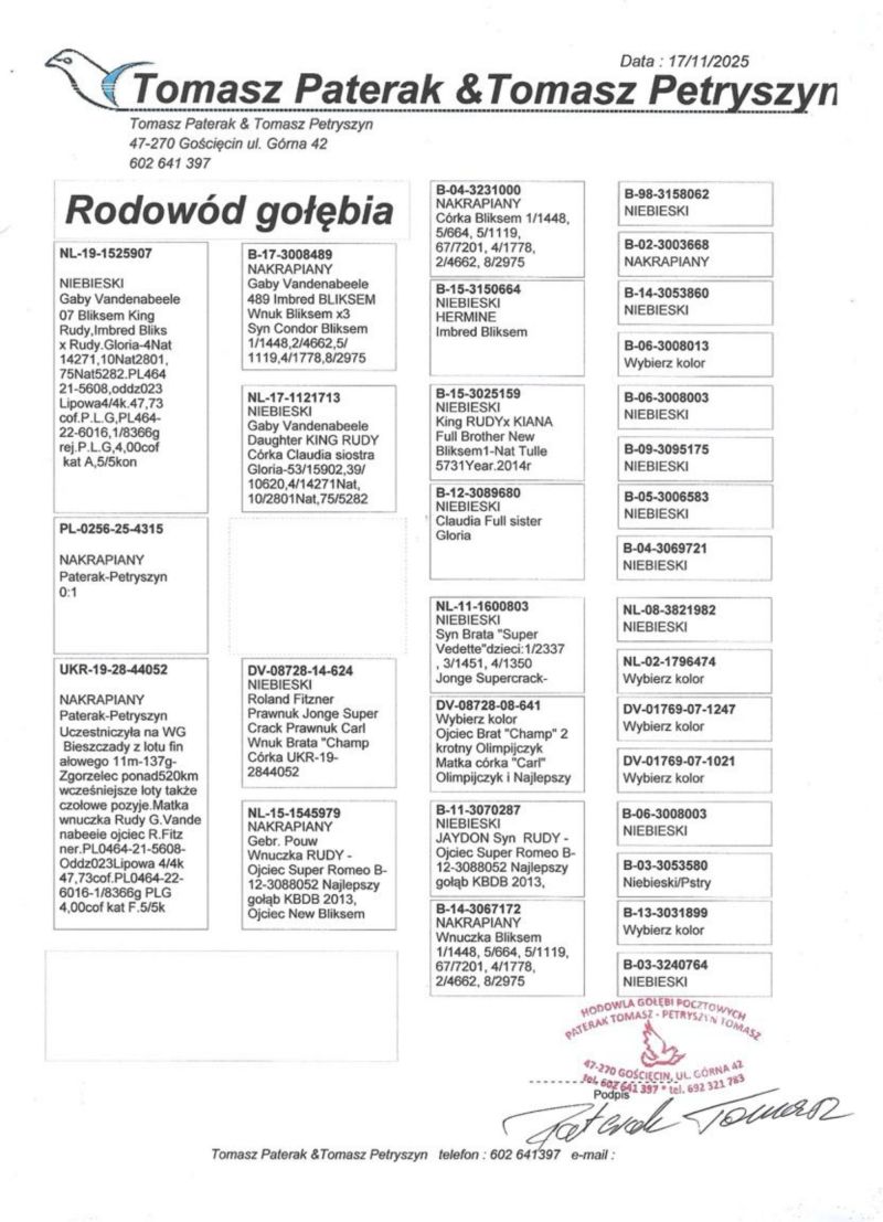 Płeć: samica Hodowca - rasa: oryg. Tomasz Paterak & Tomasz Petryszyn Zakończenie: 18.12.2025 godz. 20:34
