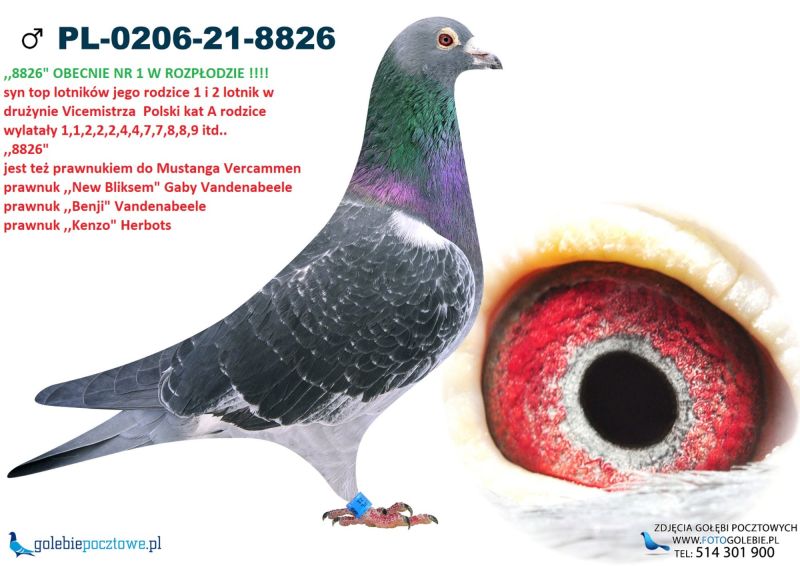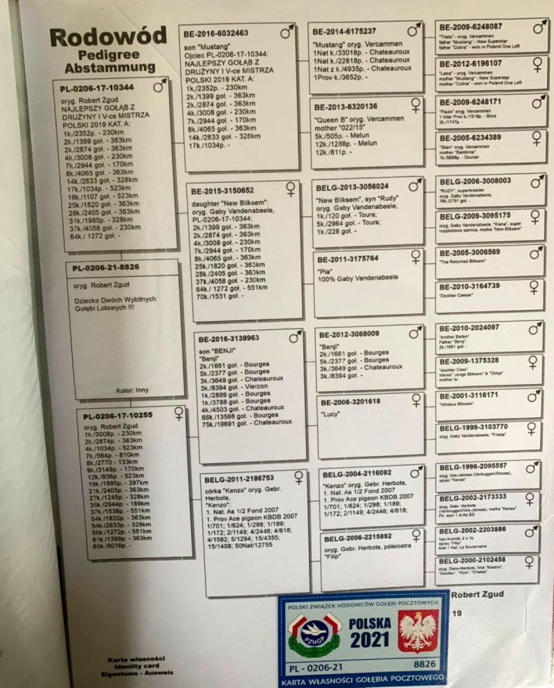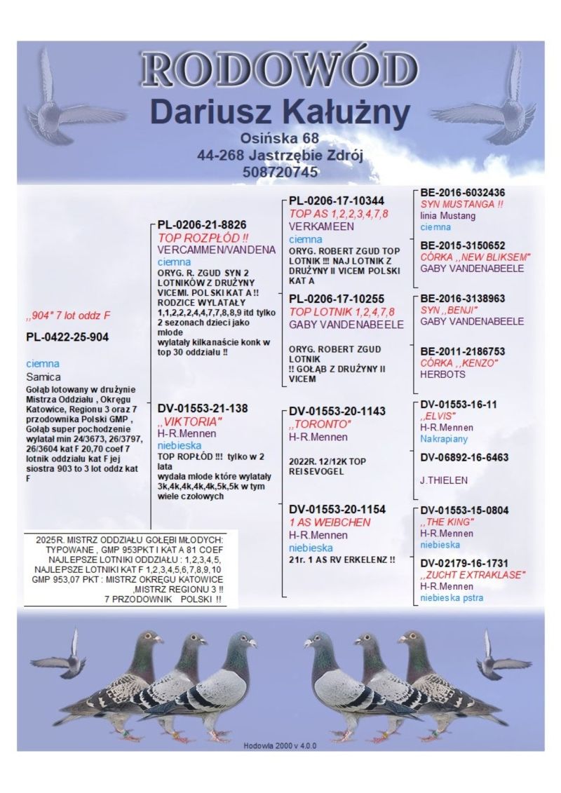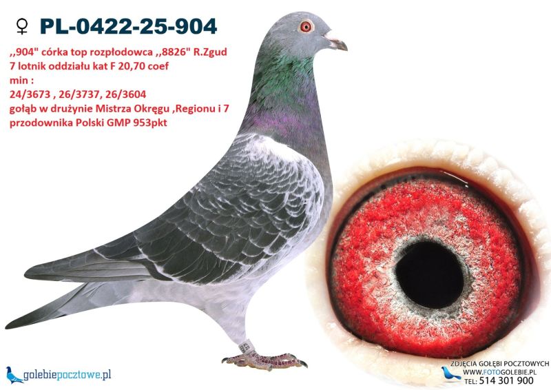 "904" 7 lotniczka oddziału kat F 20,70 coef samiczka punktująca do GMP 7 przodownika Polski min (24/3673, 26/3737, 26/3604) córka mojego top rozpłodowca "8826" od R. Zguda wnuczka top lotników u R. Zguda jak i R. Mennena. Do odstąpienia większość gołębi młodych lotowanych w drużynie którą w tym roku wylatałem Mistrza oddziału Okręgu Katowice, Regionu 3 oraz 7 przodownika Polski GMP 953pkt!! Dodam że ptaki te wylatały do kat A wynik 81 coef który dał by 3 przodownika Polski. Ptaki wylatały min. 1,2,3,4,5,6,7,8,9,10,12,13,14,16,17,20 lotnik oddziału kat F (na 3737 gołębi) dodam że niewielką ilością gołębi 3 ostatnie loty od 33-36 szt wkładane. Polecam sprzedawane są tylko te które przeszły cały sezon i uzyskały min 3 szybkie lub 4-5k . Wyniki każdego z gołębi na zdjęciu oraz w rodowodzie w razie pytań proszę pisać dzwonić. Ptaki będzie można odebrać podczas wystawy ogólnopolskiej w Katowicach (gratis) bądź kurierem koszt ok 150 zł do 3 szt,osoby które nie będą mieć możliwości by odebrać na ogólnopolskiej wystawie gołębie będą zobowiązane do przelania pieniędzy na konto zaraz po zakończonej aukcji gdyż prawdopodobnie będzie kurier jeszcze z końcem roku rozwoził ptaki (preferowany jednak odbiór w Katowicach podczas targów)