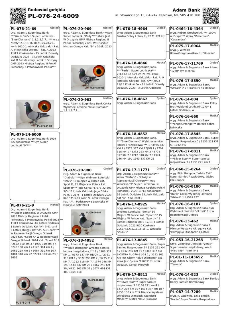 Oryginalny gołąb z hodowli Adama Bank z Oddziału 076 Wejherowo. Syn "9" bardzo dobrej samiczki lotowej, dwa razy reprezentowała Okręg w Kat. A i B na Wystawie Ogólnopolskiej, samczyk jako młody zrobił 5/5 konkursów, średniej budowy, głównie na loty sprinterskie. Więcej informacji w rodowodzie i pod numerem 505-418-160. Koszt wysyłki 150zł.