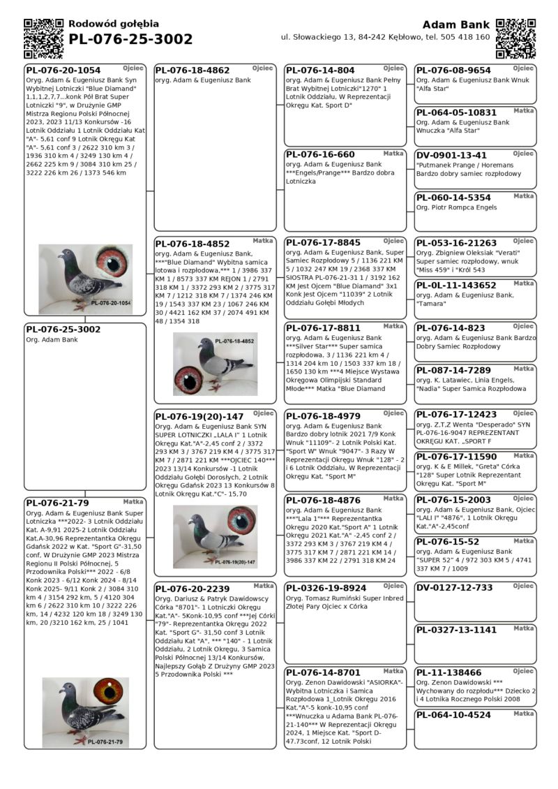 Oryginalny gołąb z hodowli Adama Bank z Oddziału 076 Wejherowo. Bardzo ładny samczyk, syn "79", która jest zresztą pełną siostrą "140". Jako roczna Reprezentowała Okręg w Kat."Sport G", jej córka jako roczna w Drużynie II Vice Mistrza Okręgu, oferowany samczyk to też wnuk "Blue Diamand" Więcej informacji w rodowodzie i pod numerem 505-418-160. Koszt wysyłki 150zł.