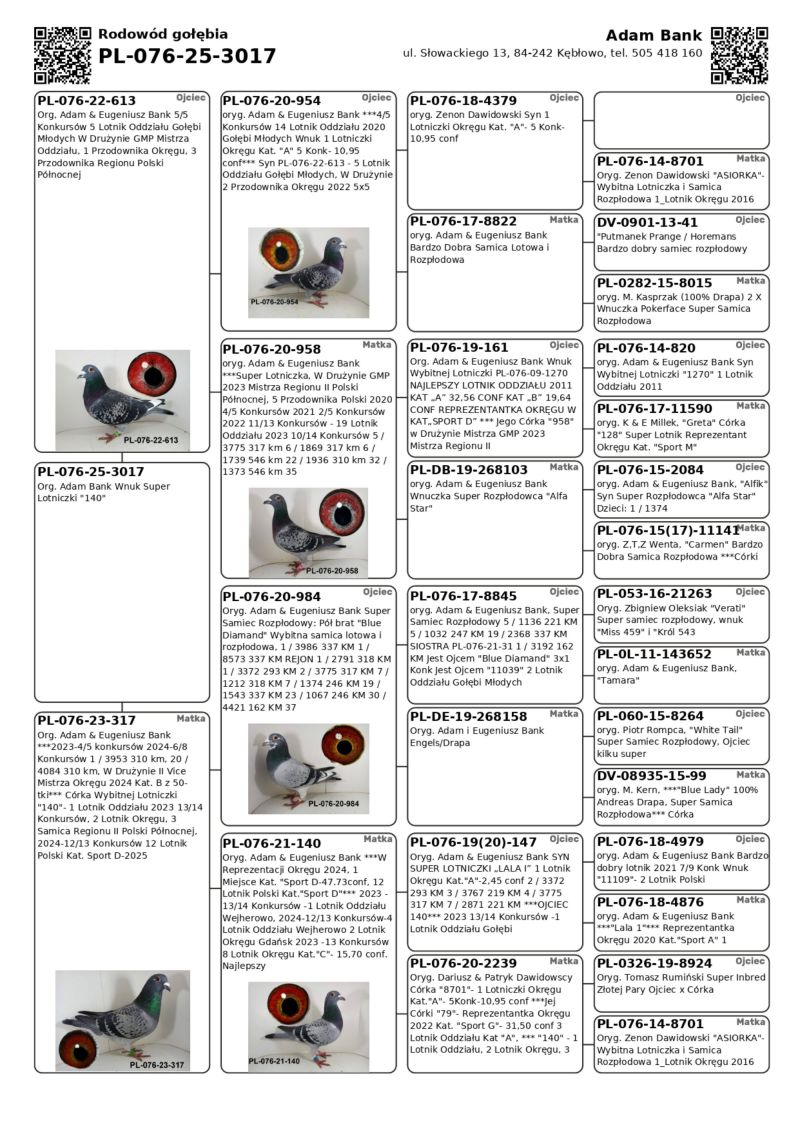 Oryginalny gołąb z hodowli Adama Bank z Oddziału 076 Wejherowo. Wnuk "140" a zarazem syn jej najszybszej córki "317" która była razem z nią w Drużynie II Vice Mistrza Okręgu Kat.B, ojciec to 5 Lotnik Oddziału Gołębi Młodych 2022. Więcej informacji w rodowodzie i pod numerem 505-418-160. Koszt wysyłki 150zł.