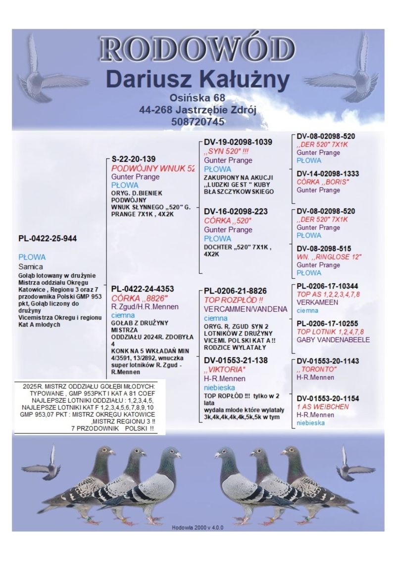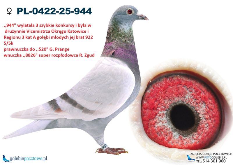 "944" Samiczka w punktująca w drużynie Vicemistrza okręgu i II Vicem Regionu kat A . Ojciec to podwójny wnuk słynnego "520 7x1k G.Prange dziadka 944 kupił D.Bieniek na aukcji "Ludzki Gest" Kuby Błaszczykowskiego za kilkanaście tys zł, matka 944 super latała w 24r zdobywając czołowe konk była w drużynie mistrza oddziału, jest ona córka mogo top rozpłodowca "8826" od R. Zguda. Do odstąpienia większość gołębi młodych lotowanych w drużynie którą w tym roku wylatałem Mistrza oddziału Okręgu Katowice, Regionu 3 oraz 7 przodownika Polski GMP 953pkt!! Dodam że ptaki te wylatały do kat A wynik 81 coef który dał by 3 przodownika Polski. Ptaki wylatały min. 1,2,3,4,5,6,7,8,9,10,12,13,14,16,17,20 lotnik oddziału kat F dodam że niewielką ilością gołębi 3 ostatnie loty od 33-36 szt wkładane. Polecam sprzedawane są tylko te które przeszły cały sezon i uzyskały min 3 szybkie lub 4-5k. Polecam. Wyniki każdego z gołębi na zdjęciu oraz w rodowodzie w razie pytań proszę pisać dzwonić .Ptaki będzie można odebrać podczas wystawy ogólnopolskiej w Katowicach (gratis) bądź kurierem koszt ok 150 zł do 3 szt, osoby które nie będą mieć możliwości by odebrać na ogólnopolskiej wystawie gołębie będą zobowiązane do przelania pieniędzy na konto zaraz po zakończonej aukcji gdyż prawdopodobnie będzie kurier jeszcze z końcem roku rozwoził ptaki (preferowany jednak odbiór w Katowicach podczas targów)