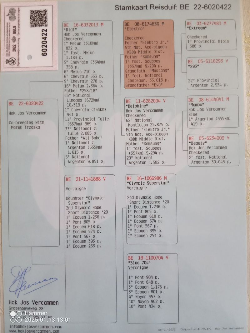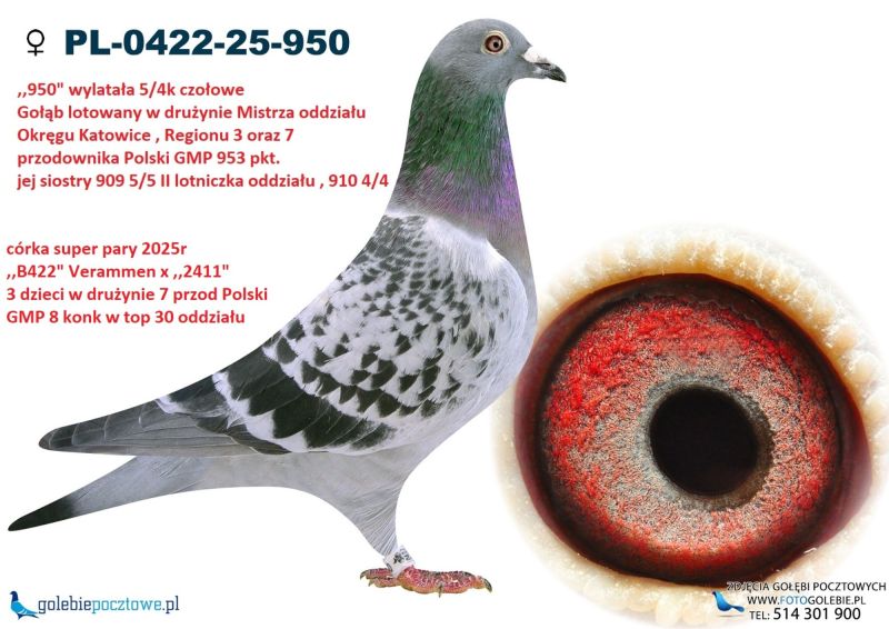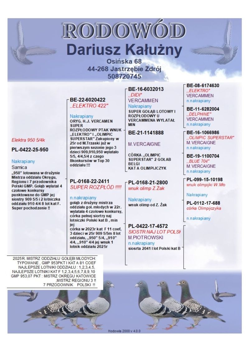 "950" samiczka wylatała 4 szybkie konkursy punktując do drużyny 7 przodownika Polski GMP. Super pochodzenie Ojciec Vercammen z łączenia syna Elektro x córka Olimpic Superstar 2 as Belgii sprintu matka to super samica rozpłodowa na mojej hodowli linia 1 lotniczki Polski kat B. Do odstąpienia większość gołębi młodych lotowanych w drużynie którą w tym roku wylatałem Mistrza oddziału Okręgu Katowice, Regionu 3 oraz 7 przodownika Polski GMP 953pkt!! Dodam że ptaki te wylatały do kat A wynik 81 coef który dałby 3 przodownika Polski. Ptaki wylatały min. 1,2,3,4,5,6,7,8,9,10,12,13,14,16,17,20 lotnik oddziału kat F (na 3737 gołębi) dodam że niewielką ilością gołębi 3 ostatnie loty od 33-36 szt wkładane. Polecam sprzedawane są tylko te które przeszły cały sezon i uzyskały min 3 szybkie lub 4-5k. Wyniki każdego z gołębi na zdjęciu oraz w rodowodzie w razie pytań proszę pisać dzwonić. Ptaki będzie można odebrać podczas wystawy ogólnopolskiej w Katowicach (gratis) bądź kurierem koszt ok 150 zł do 3 szt, osoby które nie będą mieć możliwości by odebrać na ogólnopolskiej wystawie gołębie będą zobowiązane do przelania pieniędzy na konto zaraz po zakończonej aukcji gdyż prawdopodobnie będzie kurier jeszcze z końcem roku rozwoził ptaki (preferowany jednak odbiór w Katowicach podczas targów)