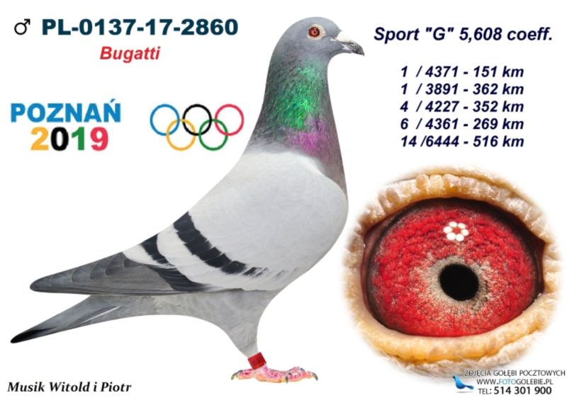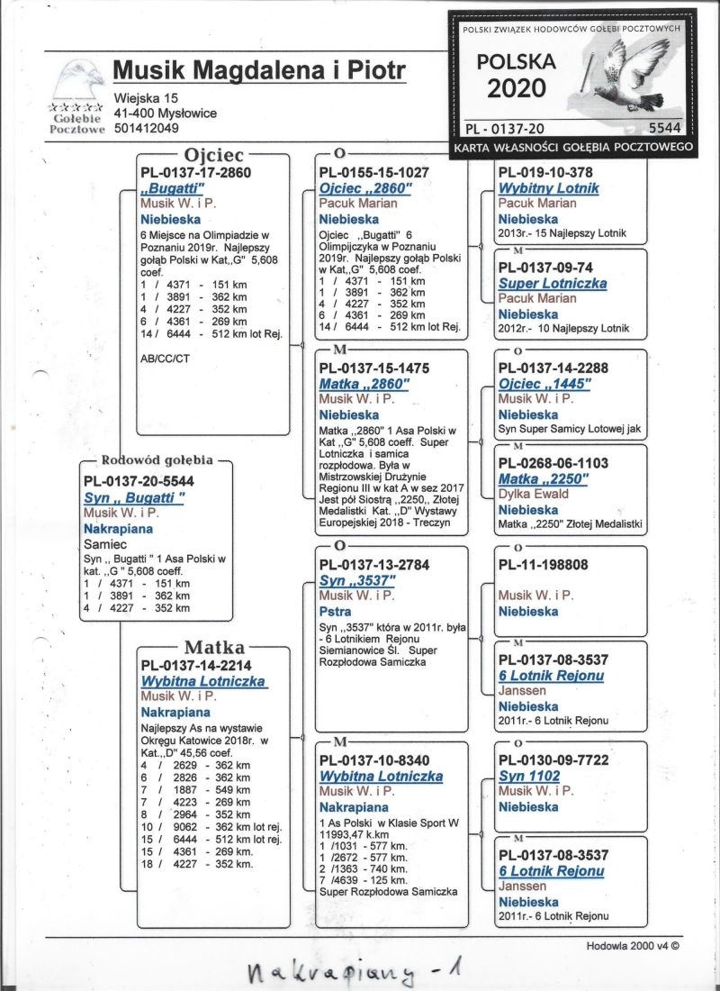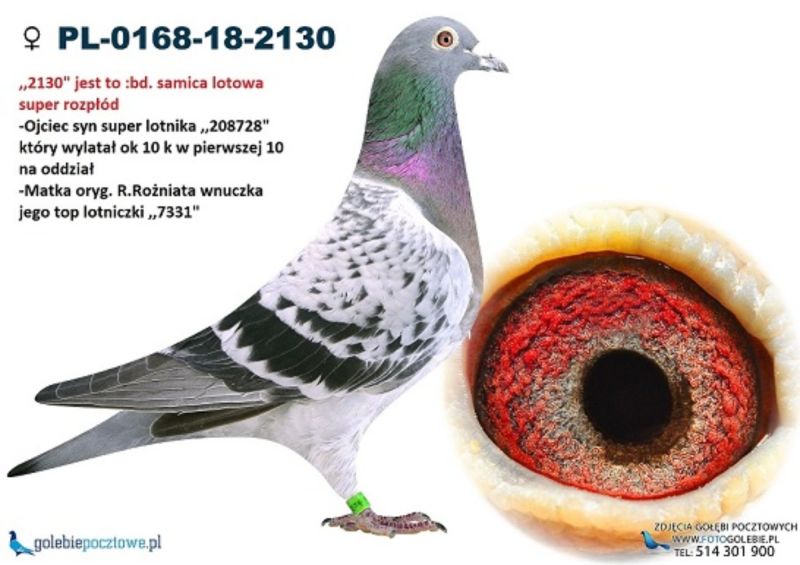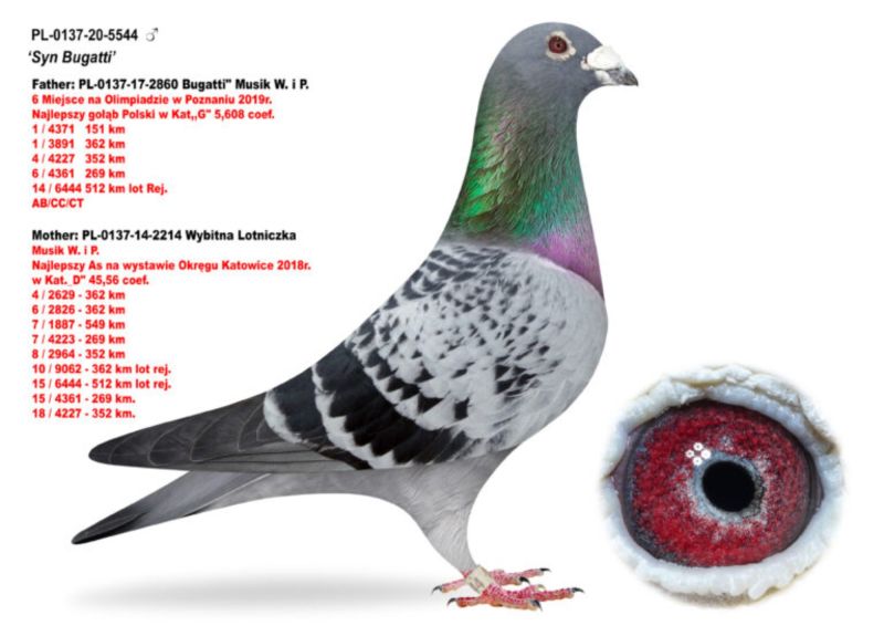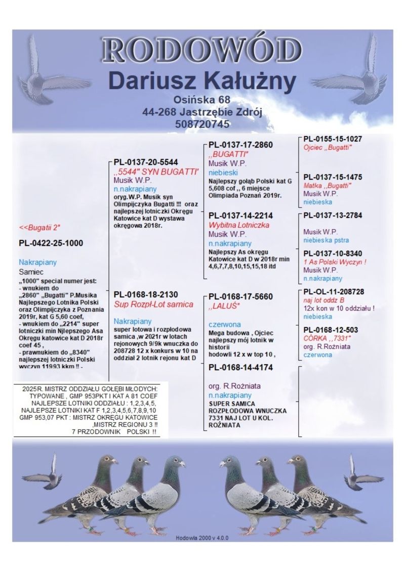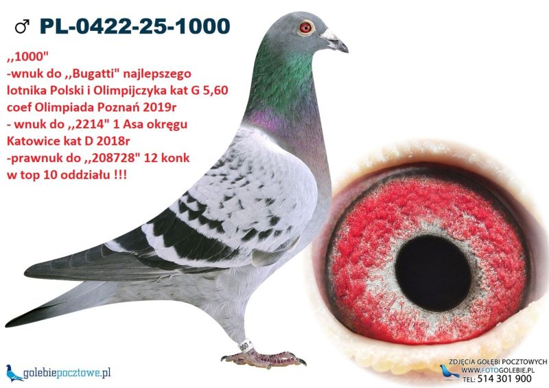 "1000" gołąb nie lotowany z czerwca z bardzo dobrym pochodzeniem .Wnuk super lotników min wnuk do najlepszego lotnika Polski kat G i olimpijczyka Bugatti P. Musika jak i najlepszej lotniczki Okręgu Katowice kat D. Bardzo fajnej budowy.