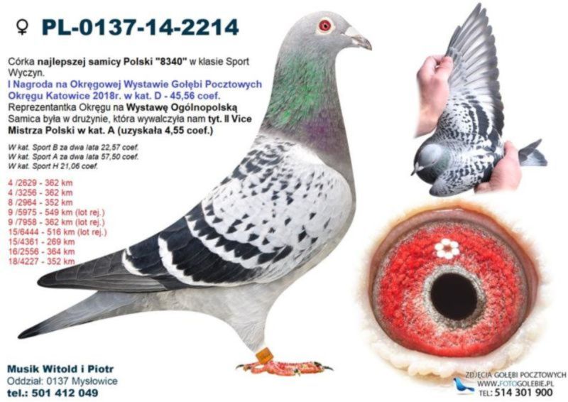 Do odstąpienia większość gołębi młodych lotowanych w drużynie którą w tym roku wylatałem Mistrza oddziału Okręgu Katowice, Regionu 3!!! oraz 7 przodownika Polski GMP 953pkt!! Dodam że ptaki te wylatały do kat A wynik 81 coef który dał by 3 przodownika Polski. Ptaki wylatały min. 1,2,3,4,5,6,7,8,9,10,12,13,14,16,17,20 lotnik oddziału kat F dodam że niewielką ilością gołębi 3 ostatnie loty od 33-36 szt wkładane. Polecam sprzedawane są tylko te które przeszły cały sezon i uzyskały min 3 szybkie lub 4-5k. Polecam. Wyniki każdego z gołębi na zdjęciu oraz w rodowodzie w razie pytań proszę pisać dzwonić. Ptaki będzie można odebrać podczas wystawy ogólnopolskiej w Katowicach (gratis) bądź kurierem koszt ok 150 zł do 3 szt osoby które nie będą mieć możliwości by odebrać na ogólnopolskiej wystawie gołębie będą zobowiązane do przelania pieniędzy na konto zaraz po zakończonej aukcji gdyż prawdopodobnie będzie kurier jeszcze z końcem roku rozwoził ptaki (preferowany jednak odbiór w Katowicach podczas targów) ,