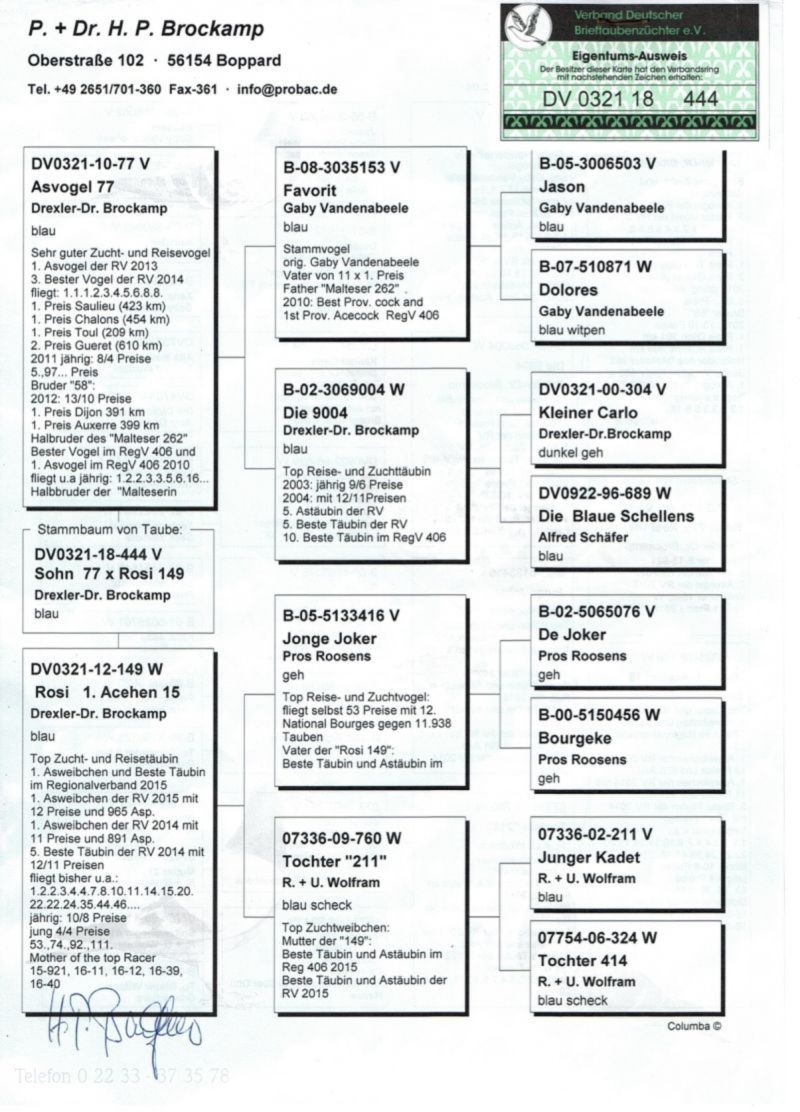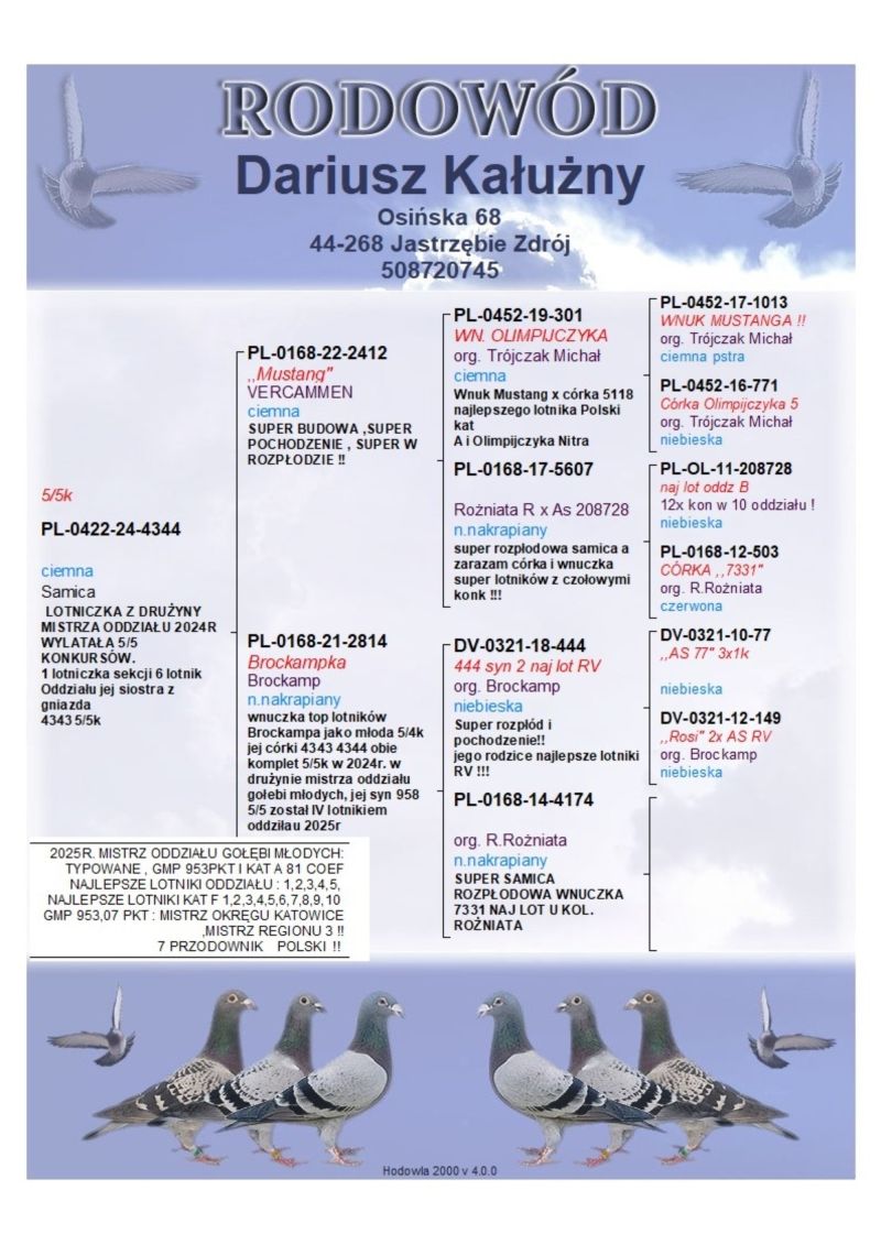 "4344" Samiczka lotowana w drużynie Mistrza oddziału 2024r. wylatała 5/5k została 1 lotnikiem sekcji oraz 6 lotniczką oddziału na ok 4 tyś gołębi do gołąbka dodatkowo będzie dyplom dodany super linia gołębi Trójczak x Brockamp .Do odstąpienia większość gołębi młodych lotowanych w drużynie którą w tym roku wylatałem Mistrza oddziału Okręgu Katowice, Regionu 3 oraz 7 przodownika Polski GMP 953pkt!! Dodam że ptaki te wylatały do kat A wynik 81 coef który dał by 3 przodownika Polski. Ptaki wylatały min. 1,2,3,4,5,6,7,8,9,10,12,13,14,16,17,20 lotnik oddziału kat F (na 3737 gołębi) dodam że niewielką ilością gołębi 3 ostatnie loty od 33-36 szt wkładane. Polecam sprzedawane są tylko te które przeszły cały sezon i uzyskały min 3 szybkie lub 4-5k. Wyniki każdego z gołębi na zdjęciu oraz w rodowodzie w razie pytań proszę pisać dzwonić. Ptaki będzie można odebrać podczas wystawy ogólnopolskiej w Katowicach (gratis) bądź kurierem koszt ok 150 zł do 3 szt, osoby które nie będą mieć możliwości by odebrać na ogólnopolskiej wystawie gołębie będą zobowiązane do przelania pieniędzy na konto zaraz po zakończonej aukcji gdyż prawdopodobnie będzie kurier jeszcze z końcem roku rozwoził ptaki (preferowany jednak odbiór w Katowicach podczas targów)