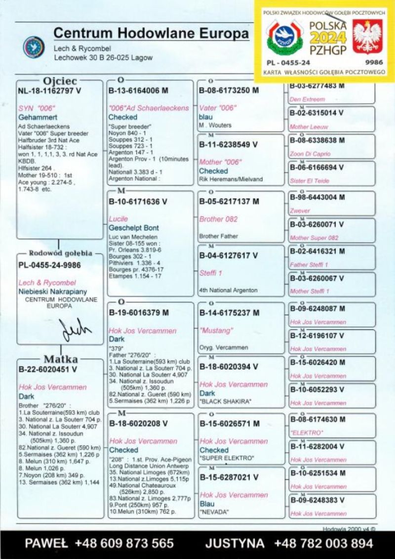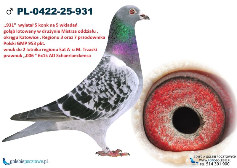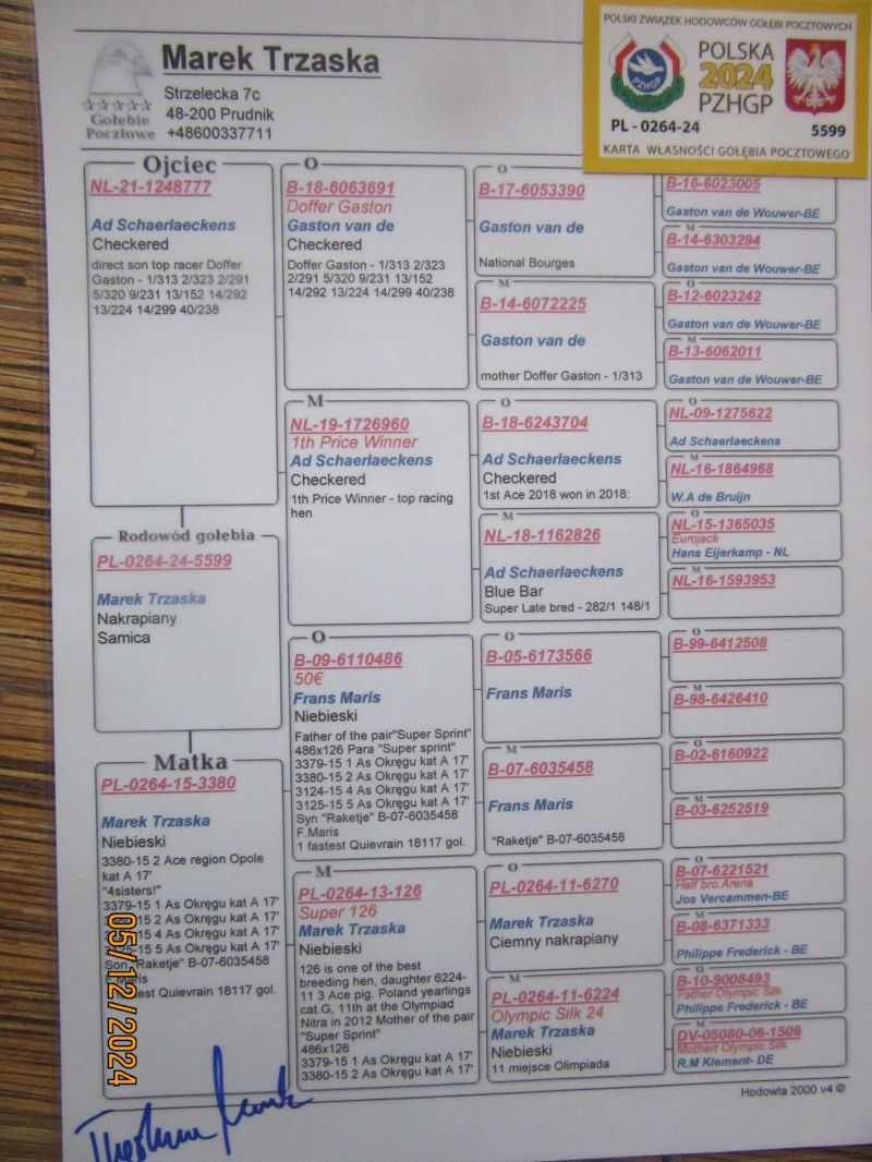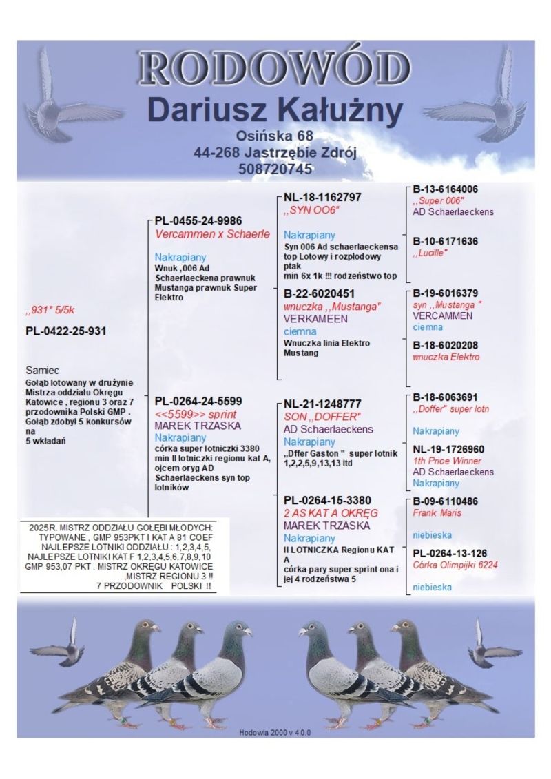 "931" samczyk lotowany zdobył 5/5k jego matka od M. Trzaski córka 2 lotniczki regionu kat A z pary "super sprint" Ojciec to połączenie Syna "006" super asa lotowego i rozpłodowego Ad Schaerlaeckensa x wnuczka Mustang. Do odstąpienia większość gołębi młodych lotowanych w drużynie którą w tym roku wylatałem Mistrza oddziału Okręgu Katowice, Regionu 3 oraz 7 przodownika Polski GMP 953pkt!! Dodam że ptaki te wylatały do kat A wynik 81 coef który dał by 3 przodownika Polski. Ptaki wylatały min. 1,2,3,4,5,6,7,8,9,10,12,13,14,16,17,20 lotnik oddziału kat F (na 3737 gołębi) dodam że niewielką ilością gołębi 3 ostatnie loty od 33-36 szt wkładane. Polecam sprzedawane są tylko te które przeszły cały sezon i uzyskały min 3 szybkie lub 4-5k. Wyniki każdego z gołębi na zdjęciu oraz w rodowodzie w razie pytań proszę pisać dzwonić. Ptaki będzie można odebrać podczas wystawy ogólnopolskiej w Katowicach (gratis) bądź kurierem koszt ok 150 zł do 3 szt, osoby które nie będą mieć możliwości by odebrać na ogólnopolskiej wystawie gołębie będą zobowiązane do przelania pieniędzy na konto zaraz po zakończonej aukcji gdyż prawdopodobnie będzie kurier jeszcze z końcem roku rozwoził ptaki (preferowany jednak odbiór w Katowicach podczas targów)