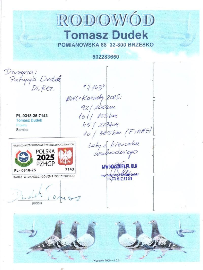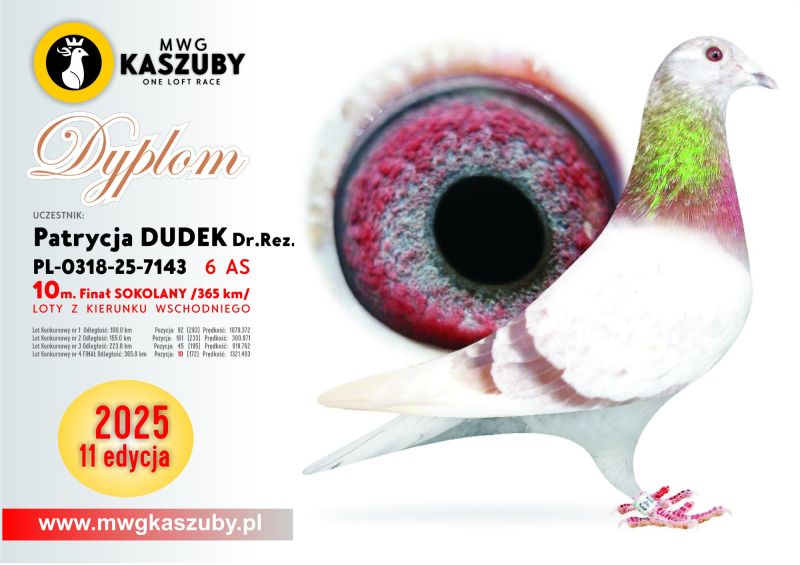 Gołąb (10 MIEJSCE z lotu Finałowego) brał udział w zawodach na Wspólnym Gołębniku KASZUBY. Więcej informacji w rodowodzie i załącznikach. Kontakt do Właściciela Gołębnika tel.601686344 (Sebastian Ostoja-Lniski). Informujemy poza tym, że rozpoczęły się zapisy na sezon 2026. Serdecznie zapraszam do rywalizacji..... Uwaga! Koszty związane z transportem pokrywa nabywca gołębia. W zależności od kuriera wynoszą one około 150zł. Można również odebrać gołębia osobiście. Powyżej sylwetki gołębia znajduje się video z jego prezentacją.