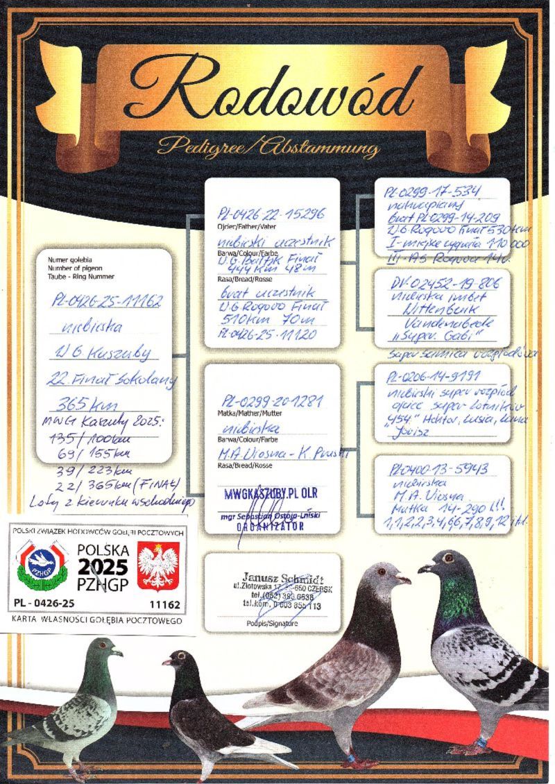 Gołąb (22 MIEJSCE z lotu Finałowego) brał udział w zawodach na Wspólnym Gołębniku KASZUBY. Więcej informacji w rodowodzie i załącznikach. Kontakt do Właściciela Gołębnika tel.601686344 (Sebastian Ostoja-Lniski). Informujemy poza tym, że rozpoczęły się zapisy na sezon 2026. Serdecznie zapraszam do rywalizacji..... Uwaga! Koszty związane z transportem pokrywa nabywca gołębia. W zależności od kuriera wynoszą one około 150zł. Można również odebrać gołębia osobiście. Powyżej sylwetki gołębia znajduje się video z jego prezentacją.