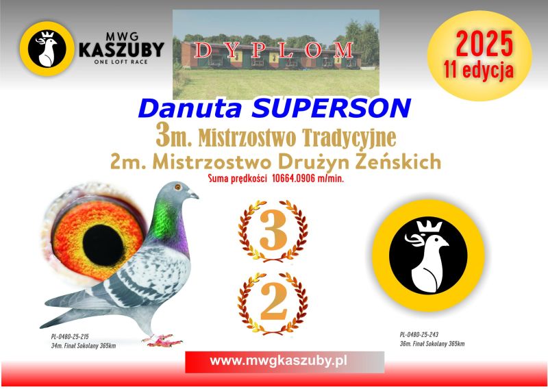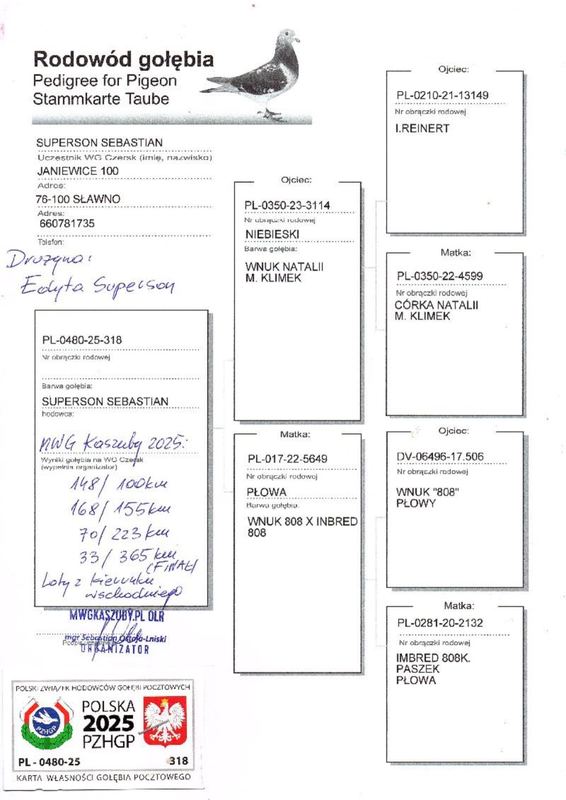 Gołąb (33 MIEJSCE z lotu Finałowego) brał udział w zawodach na Wspólnym Gołębniku KASZUBY. Więcej informacji w rodowodzie i załącznikach. Kontakt do Właściciela Gołębnika tel.601686344 (Sebastian Ostoja-Lniski). Informujemy poza tym, że rozpoczęły się zapisy na sezon 2026. Serdecznie zapraszam do rywalizacji..... Uwaga! Koszty związane z transportem pokrywa nabywca gołębia. W zależności od kuriera wynoszą one około 150zł. Można również odebrać gołębia osobiście. Powyżej sylwetki gołębia znajduje się video z jego prezentacją.