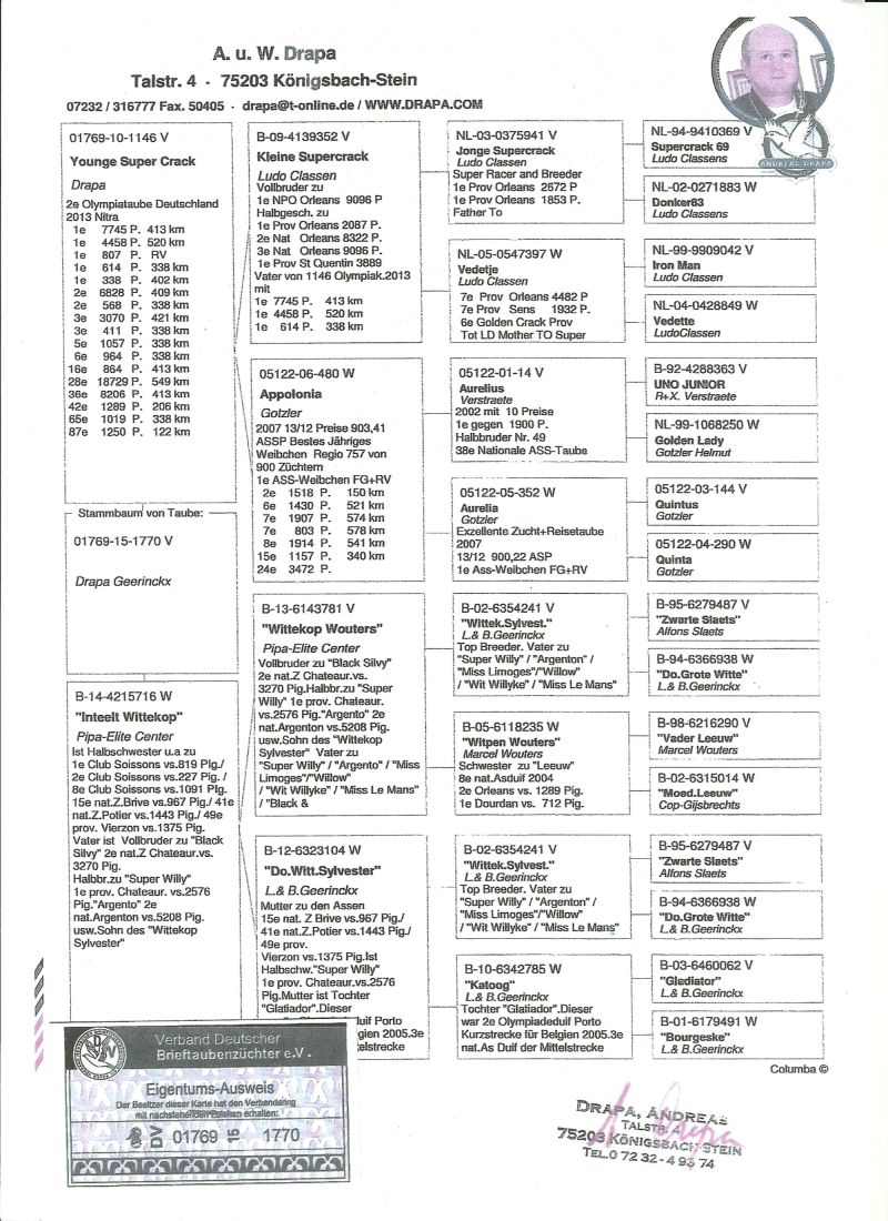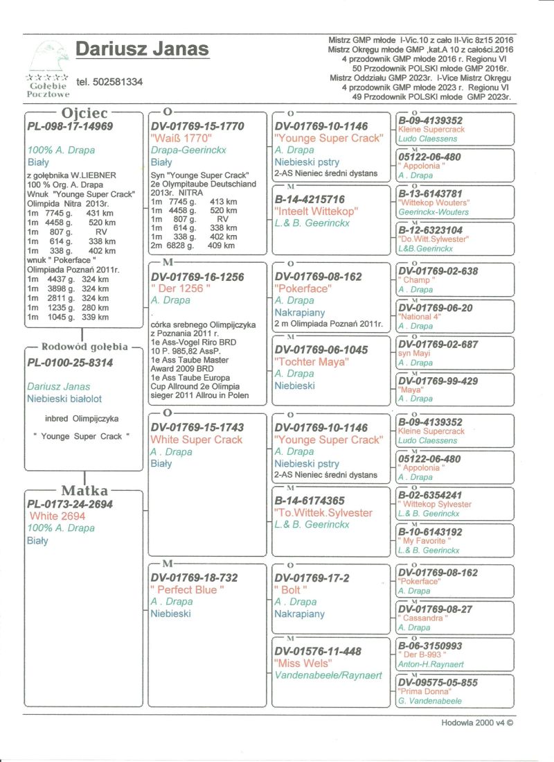 Oryginalny gołąb z hodowli Dariusz Janas . Szczegóły pochodzenia w rodowodzie . Więcej informacji pod nr. tel 502581334 . Oferowany gołąb to prawdopodobnie samiec .... koszt transportu do 3 szt. 120 zł.