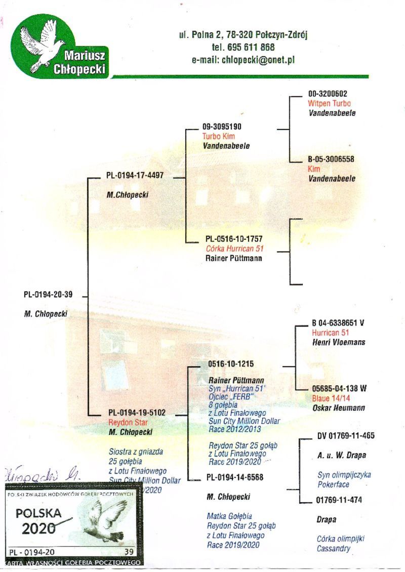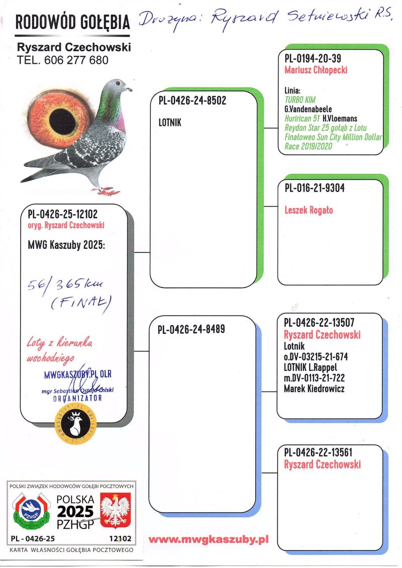 Gołąb (56 MIEJSCE z lotu Finałowego) brał udział w zawodach na Wspólnym Gołębniku KASZUBY. Więcej informacji w rodowodzie i załącznikach. Kontakt do Właściciela Gołębnika tel.601686344 (Sebastian Ostoja-Lniski). Informujemy poza tym, że rozpoczęły się zapisy na sezon 2026. Serdecznie zapraszam do rywalizacji..... Uwaga! Koszty związane z transportem pokrywa nabywca gołębia. W zależności od kuriera wynoszą one około 150zł. Można również odebrać gołębia osobiście. Powyżej sylwetki gołębia znajduje się video z jego prezentacją.