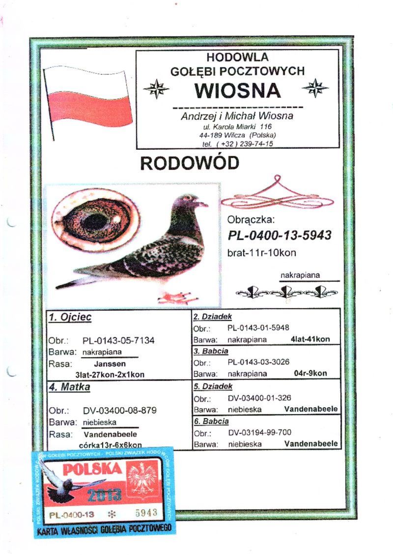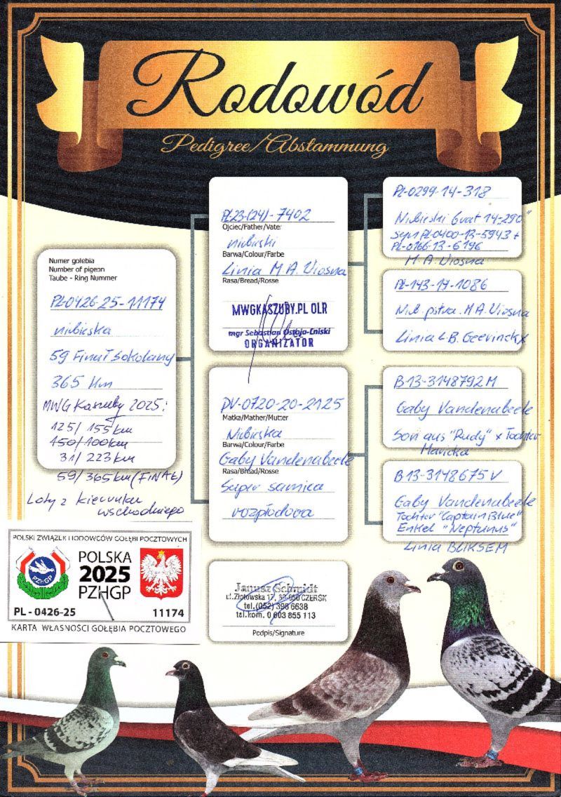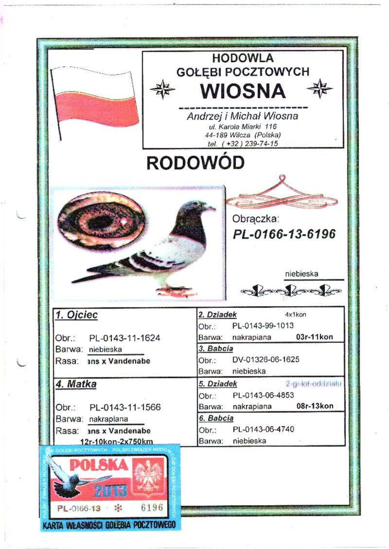 Gołąb (59 MIEJSCE z lotu Finałowego) brał udział w zawodach na Wspólnym Gołębniku KASZUBY. Więcej informacji w rodowodzie i załącznikach. Kontakt do Właściciela Gołębnika tel.601686344 (Sebastian Ostoja-Lniski). Informujemy poza tym, że rozpoczęły się zapisy na sezon 2026. Serdecznie zapraszam do rywalizacji.... Uwaga! Koszty związane z transportem pokrywa nabywca gołębia. W zależności od kuriera wynoszą one około 150zł. Można również odebrać gołębia osobiście. Powyżej sylwetki gołębia znajduje się video z jego prezentacją.