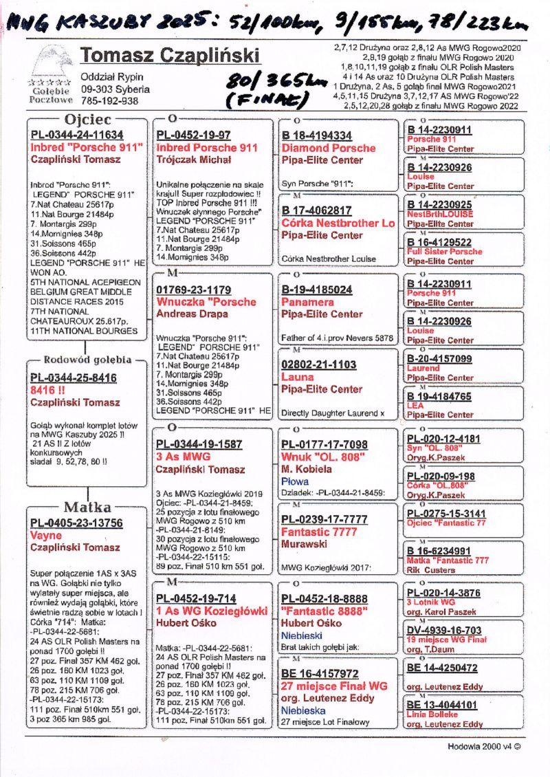 Gołąb (80 MIEJSCE z lotu Finałowego) brał udział w zawodach na Wspólnym Gołębniku KASZUBY. Więcej informacji w rodowodzie i załącznikach. Kontakt do Właściciela Gołębnika tel.601686344 (Sebastian Ostoja-Lniski). Informujemy poza tym, że rozpoczęły się zapisy na sezon 2026. Serdecznie zapraszam do rywalizacji.... Uwaga! Koszty związane z transportem pokrywa nabywca gołębia. W zależności od kuriera wynoszą one około 150zł. Można również odebrać gołębia osobiście. Powyżej sylwetki gołębia znajduje się video z jego prezentacją.
