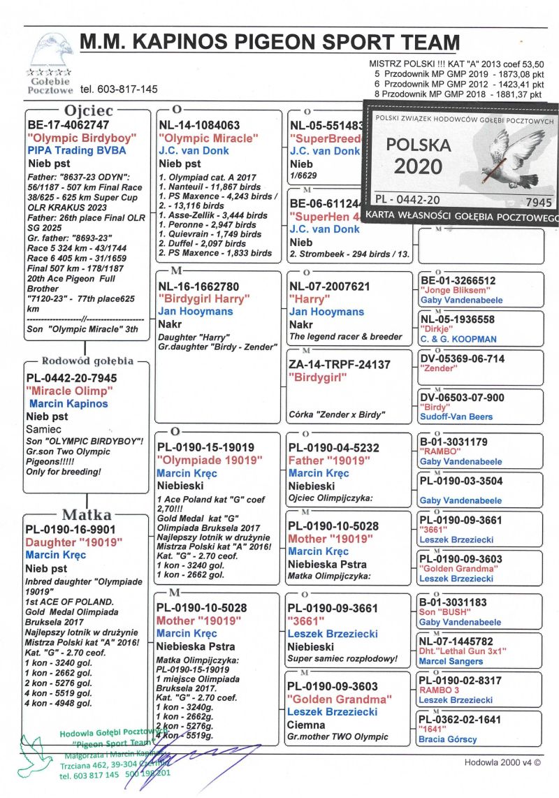 Uwaga! Gołąb będzie dostarczony tylko po wcześniejszej wpłacie na konto bankowe!! KOSZT TRANSPORTU 165 ZŁ (maksymalnie 3 gołębie w jednej paczce). Gołąb z hodowli M.M.KAPINOS Szczegóły pochodzenia w rodowodzie. Kontakt w sprawie gołębi oraz transportu pod numerem telefonu 798 456 094