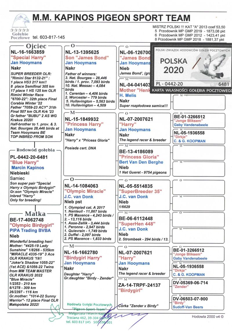 PL-0442-20-6481 Syn Olympic Birdygirl x Special Harry! top rozpłod!koszt