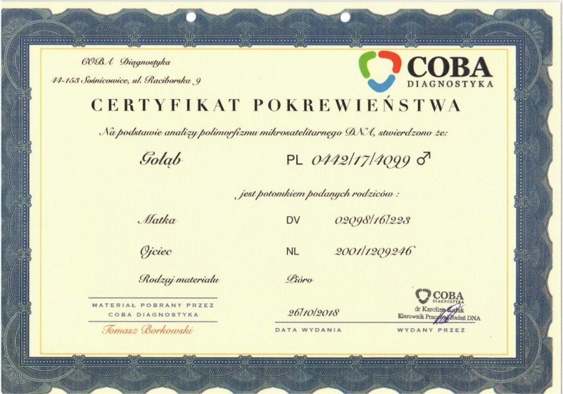 Uwaga! Gołąb będzie dostarczony tylko po wcześniejszej wpłacie na konto bankowe!! KOSZT TRANSPORTU 165 ZŁ (maksymalnie 3 gołębie w jednej paczce). Gołąb z hodowli M.M.KAPINOS Szczegóły pochodzenia w rodowodzie. Kontakt w sprawie gołębi oraz transportu pod numerem telefonu 798 456 094