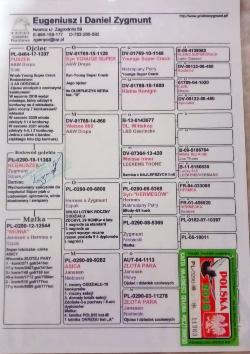 REDUKCJA ROZPŁODU Oryginalny gołąb z hodowli Eugeniusz i Daniel Zygmunt Szczegóły pochodzenia w rodowodzie. Więcej informacji pod nr tel.: 602338679