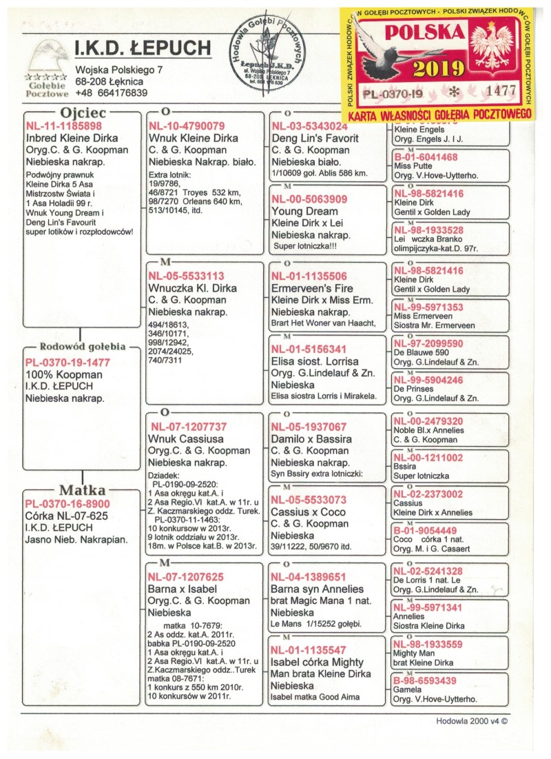 Oryginalny gołąb z hodowli IKD Łepuch. Szczegóły pochodzenia w rodowodzie. Więcej informacji pod nr tel.: 507 805 142 *koszt wysyłki po stronie kupującego **przed zalicytowaniem proszę o kontakt z właścicielem w sprawie płci oferowanego gołębia