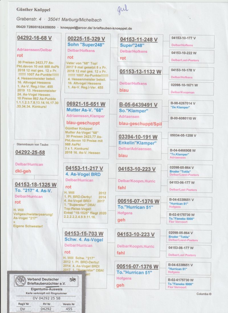 Mlody gołąb ,którego ojcem jest '68-16"super lotnik u G.Knoeppel który zdobył m.in 2018r.12/12 kon.jego czołowe kon.to:1;1;1;2;3;7;8;13;14;16;17.Matką tego młodego jest córka słynnego ROTE Ass 217 H.Will!Koszty wysyłki 150 zł(1-3 szt)