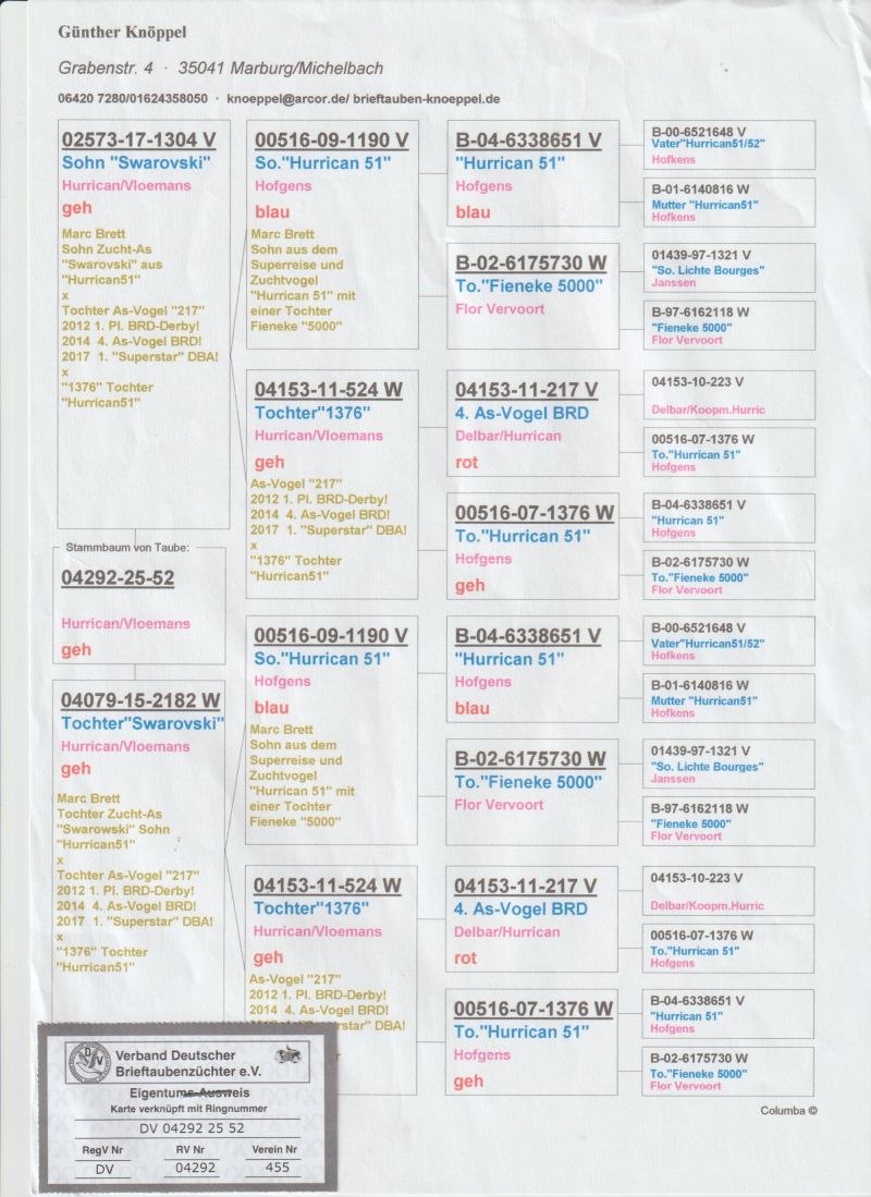 Młody gołąb z kolekcji Hurrican51 Ginther Knoeppel.Syn x córka wybitnego rozpłodowca "1190-SWAROVSKI M.Bret syn Hurrican 51 x 730 córka Fieneke 5000.W pochodzeniu sama kolekcja naj.gołębi Hofgens!Koszt wysyłki 150 zł(1-3 szt)