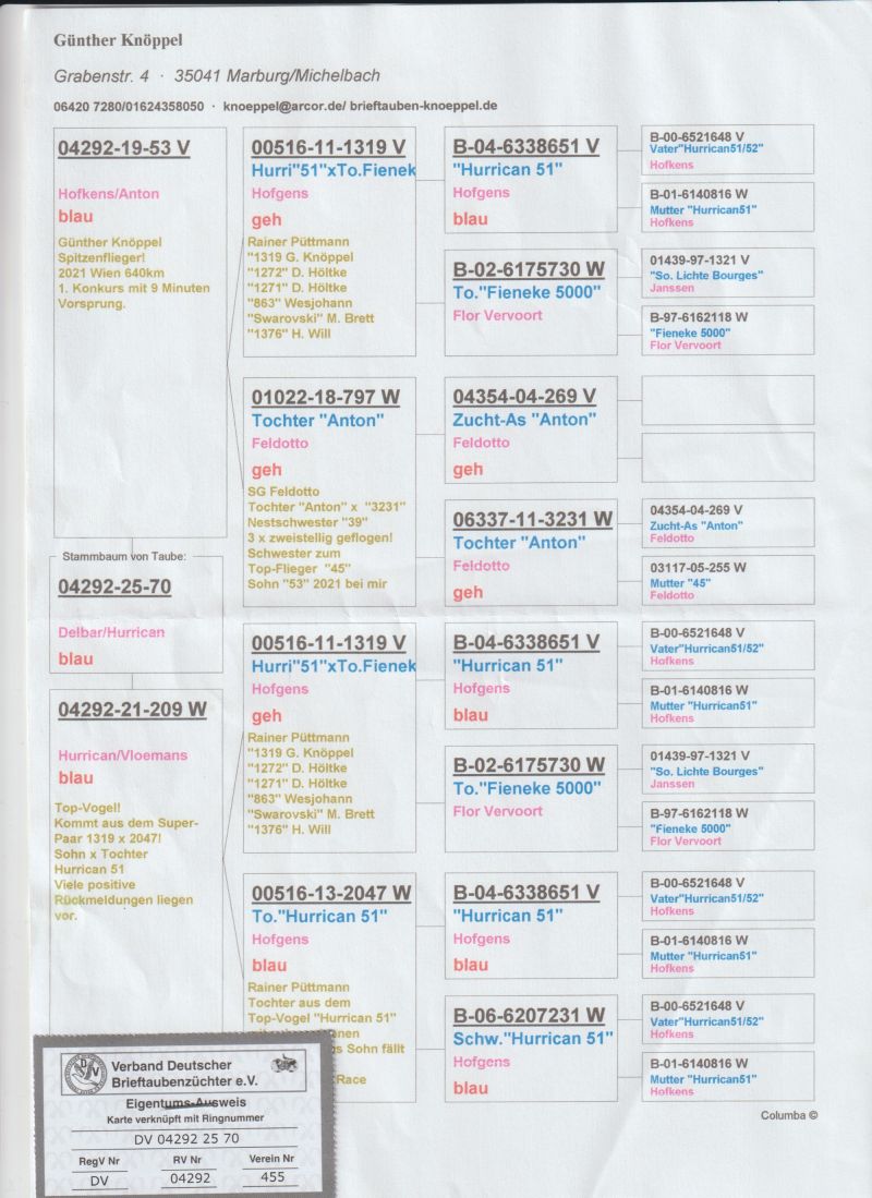 Młody gołąb,którego ojcem jest"53-19"z połączenia 1319-11 syn H51 x 730,a matką jest "797" córka Antona 269 Feldotto! Wnuk Hurrican51."53-19"lotowany u G.Knoeppel zd.m.in 1kon.z 640km z 9 min wyprzedzeniem w tródnym locie z Wiednia!Matką jest także wnuczka Hurrican 51 x 730.Koszt wysyłki 150 zł(1-3 szt)