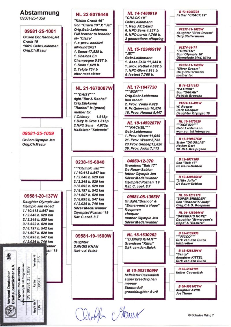 Szczegóły pochodzenia w rodowodzie oraz na opisanym zdjęciu gołębia.
