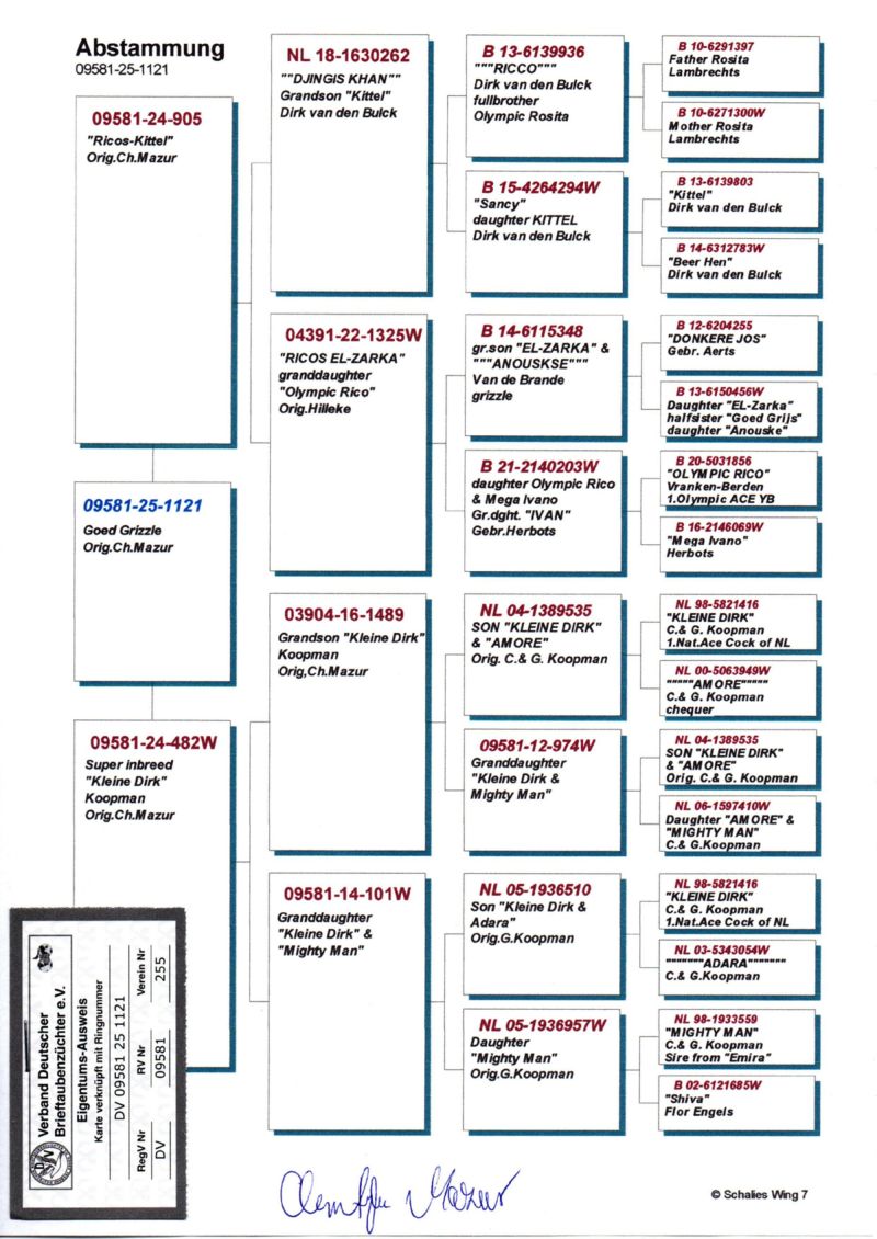 Szczegóły pochodzenia w rodowodzie oraz na opisanym zdjęciu gołębia.