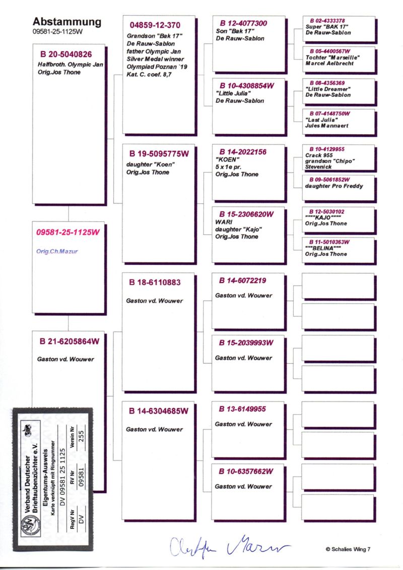 Szczegóły pochodzenia w rodowodzie oraz na opisanym zdjęciu gołębia.