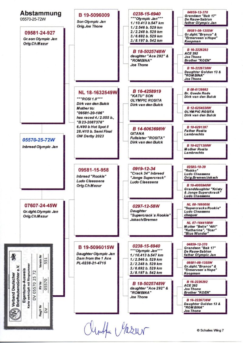 Szczegóły pochodzenia w rodowodzie oraz na opisanym zdjęciu gołębia.