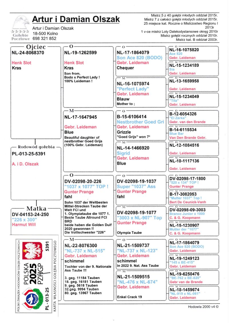 PL-013-25-5391 Wnuk brata z gniazda Goed Grijs x wnuczka 9 Asa Holandii i najlepszego gołębia świta 1037 G. Prange KUP TERAZ