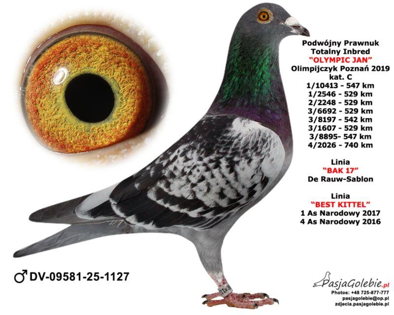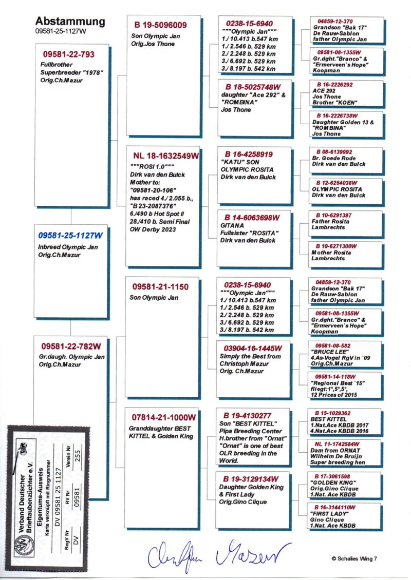 Szczegóły pochodzenia w rodowodzie oraz na opisanym zdjęciu gołębia.