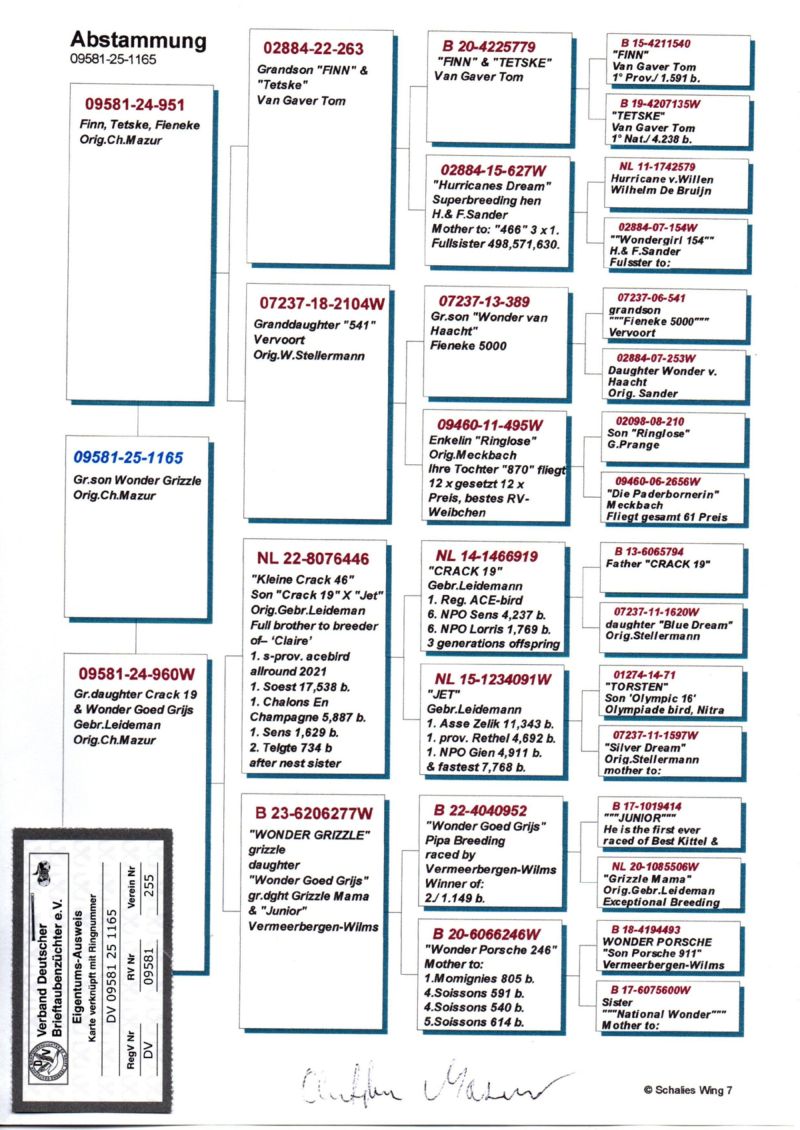 Szczegóły pochodzenia w rodowodzie oraz na opisanym zdjęciu gołębia.