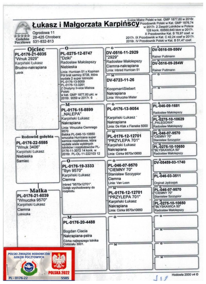 Oryginalny gołąb z hodowli Łukasza i Małgorzaty Karpińskich. Szczegóły pochodzenia w rodowodzie.