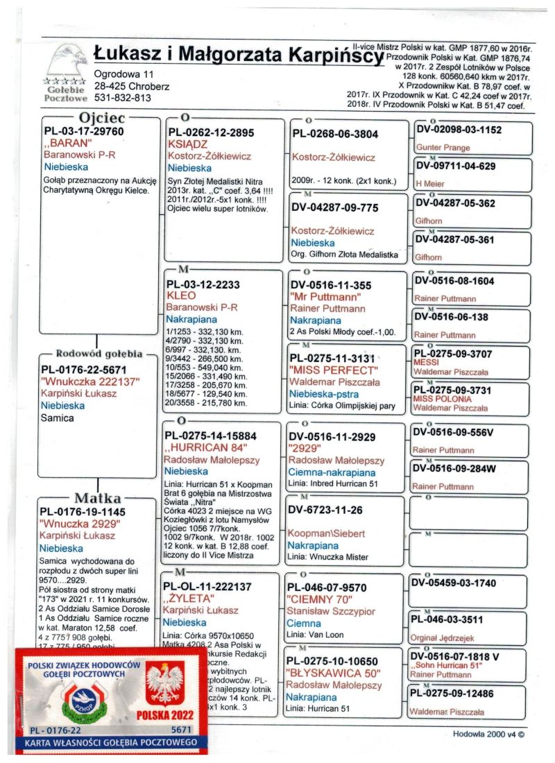 Oryginalny gołąb z hodowli Łukasza i Małgorzaty Karpińskich. Szczegóły pochodzenia w rodowodzie.