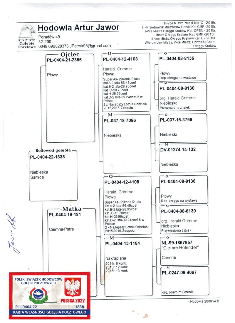 Oryginalny gołąb z hodowli Artura Jawora. Szczegóły pochodzenia w rodowodzie.