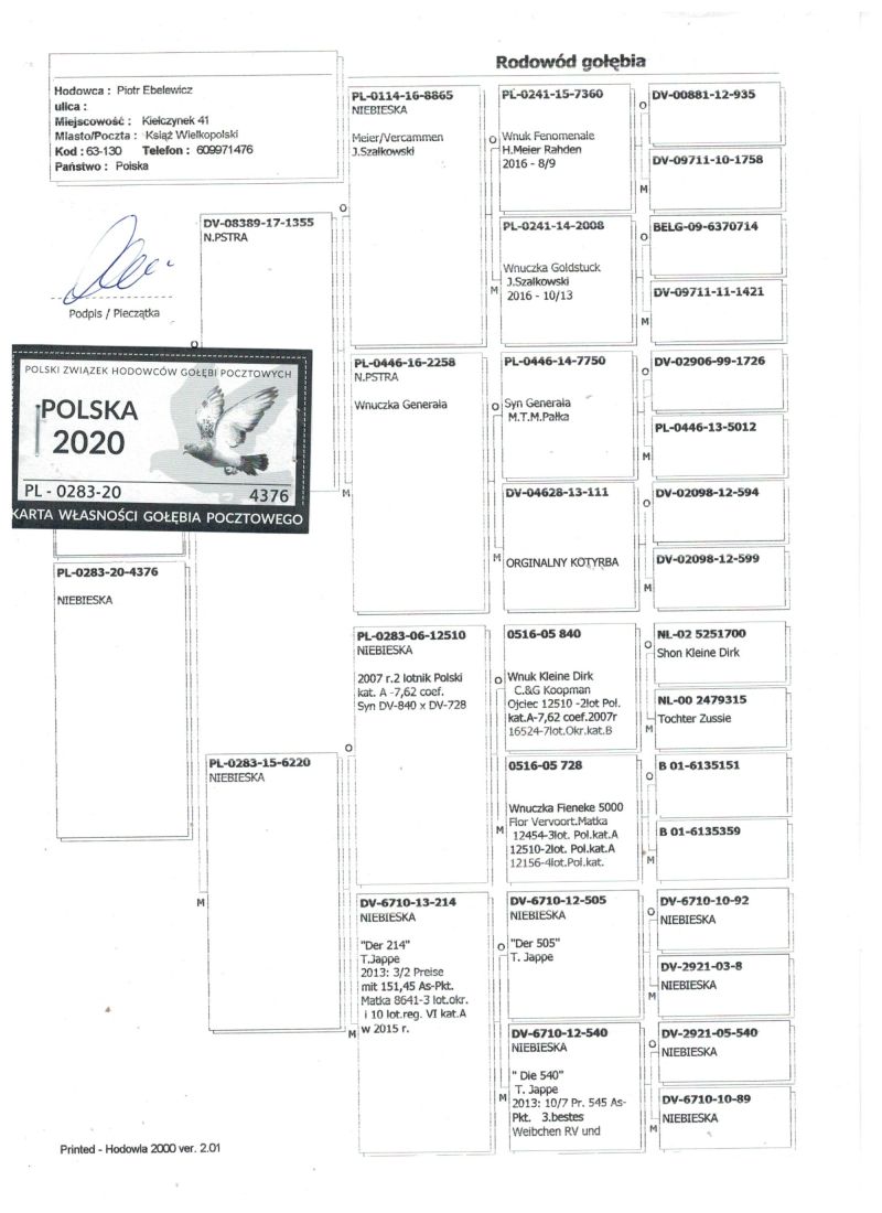 Oryginalny gołąb z hodowli Piotra Ebelewicza. Szczegóły pochodzenia w rodowodzie.