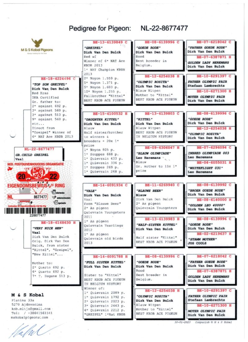 Oryginalny gołąb z hodowli M & S Kobal. Szczegóły pochodzenia w rodowodzie.