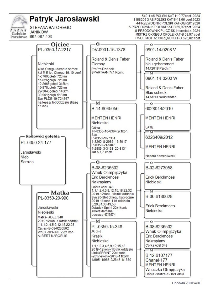 oryg. Dirk De Beer (Leideman), linia "Crack 19" Szczegóły pochodzenia w rodowodzie. Gołąb jest sprzedawany bezpośrednio od hodowcy i znajduje się w Polsce, można go obejrzeć w miejscowości Zblewo (woj. pomorskie), po wcześniejszym kontakcie telefonicznym. Więcej informacji o gołębiu i transporcie pod nr tel.: 511 607 710.